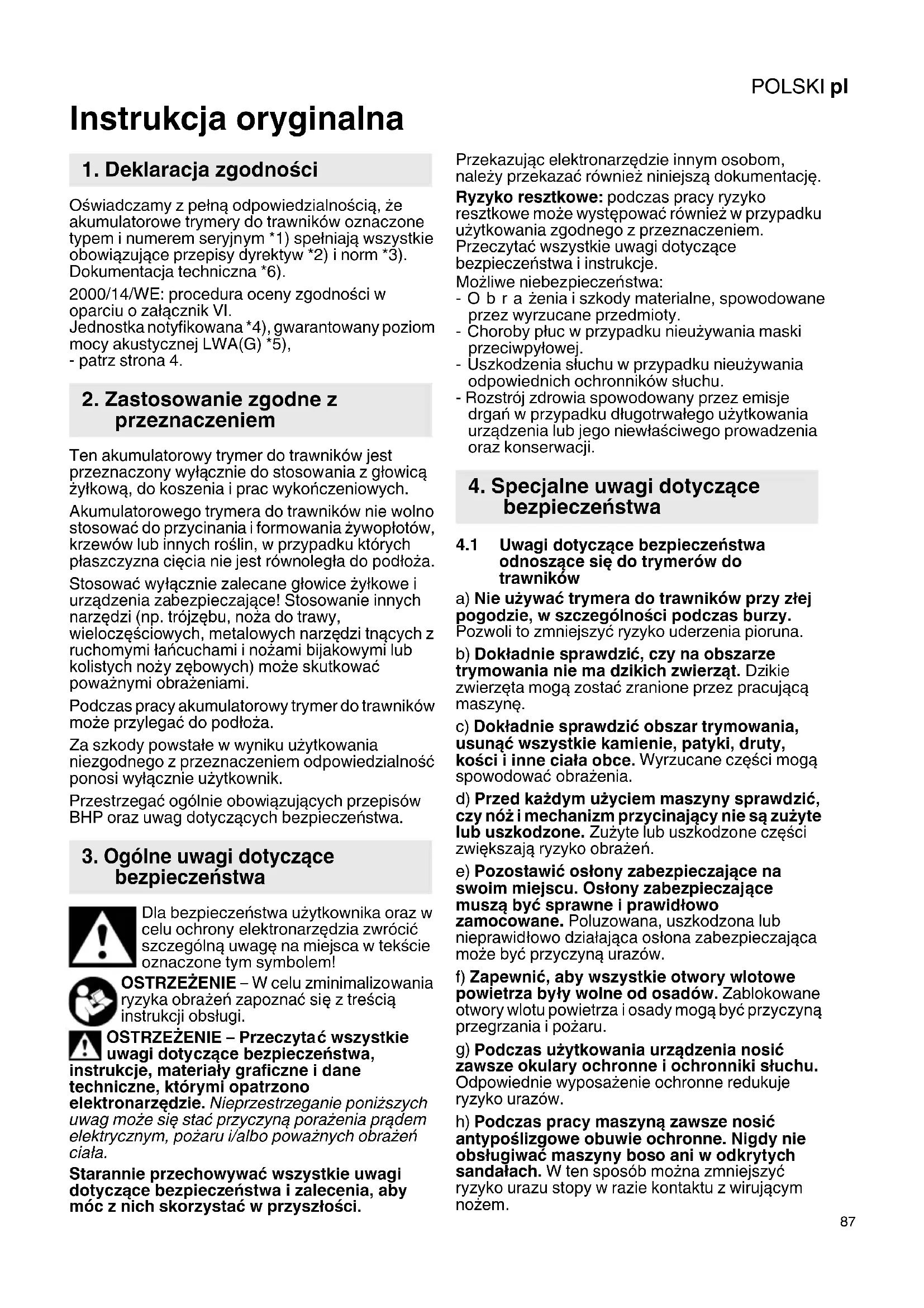 Instrukcja oryginalna Oświadczamy z pełną odpowiedzialnością, że akumulatorowe trymery do trawników oznaczone typem i numerem seryjnym *1) spełniają wszystkie obowiązujące przepisy dyrektyw *2) i norm *3). Dokumentacja techniczna *6). 2000/14/WE: procedura oceny zgodności w oparciu o załącznik VI. Jednostka notyfikowana *4), gwarantowany poziom mocy akustycznej LWA(G) *5), - patrz strona 4. Ten akumulatorowy trymer do trawników jest przeznaczony wyłącznie do stosowania z głowicą żyłkową, do koszenia i prac wykończeniowych. Akumulatorowego trymera do trawników nie wolno stosować do przycinania i formowania żywopłotów, krzewów lub innych roślin, w przypadku których płaszczyzna cięcia nie jest równoległa do podłoża. Stosować wyłącznie zalecane głowice żyłkowe i urządzenia zabezpieczające! Stosowanie innych narzędzi (np. trójzębu, noża do trawy, wieloczęściowych, metalowych narzę dzi tnących z ruchomymi łańcuchami i nożami bijakowymi lub kolistych noży zębowych) może skutkować poważnymi obrażeniami. Podczas pracy akumulatorowy trymer do trawników może przylegać do podłoża. Za szkody powstałe w wyniku użytkowania niezgodnego z przeznaczeniem odpowiedzialność ponosi wyłącznie użytkownik. Przestrzegać ogólnie obowiązujących przepisów BHP oraz uwag dotyczących bezpieczeństwa. Dla bezpieczeństwa użytkownika oraz w celu ochrony elektronarzędzia zwrócić szczególną uwagę na miejsca w tekście oznaczone tym symbolem! OSTRZEŻENIE – W celu zminimalizowania ryzyka obrażeń zapoznać się z treścią instrukcji obsługi. OSTRZEŻENIE – Przeczyta ć wszystkie uwagi dotyczące bezpieczeństwa, instrukcje, materiały graficzne i dane techniczne, którymi opatrzono elektronarzędzie. Nieprzestrzeganie poniższych uwag może się stać przyczyną porażenia prądem elektrycznym, pożaru i/albo poważnych obrażeń ciała. Starannie przechowywać wszystkie uwagi dotyczące bezpieczeństwa i zalecenia, aby móc z nich skorzystać w przyszłości. Przekazując elektronarzędzie innym osobom, należy przekazać również niniejszą dokumentację. Ryzyko resztkowe: podczas pracy ryzyko resztkowe może występować również w przypadku użytkowania zgodnego z przeznaczeniem. Przeczytać wszystkie uwagi dotyczące bezpieczeństwa i instrukcje. Możliwe niebezpieczeństwa: -Obrażenia i szkody materialne, spowodowane przez wyrzucane przedmioty. -Choroby płuc w przypadku nieużywania maski przeciwpyłowej. - Uszkodzenia słuchu w przypadku nieużywania odpowiednich ochronników słuchu. - Rozstrój zdrowia spowodowany przez emisje drgań w przypadku długotrwałego użytkowania urządzenia lub jego niewłaściwego prowadzenia oraz konserwacji.