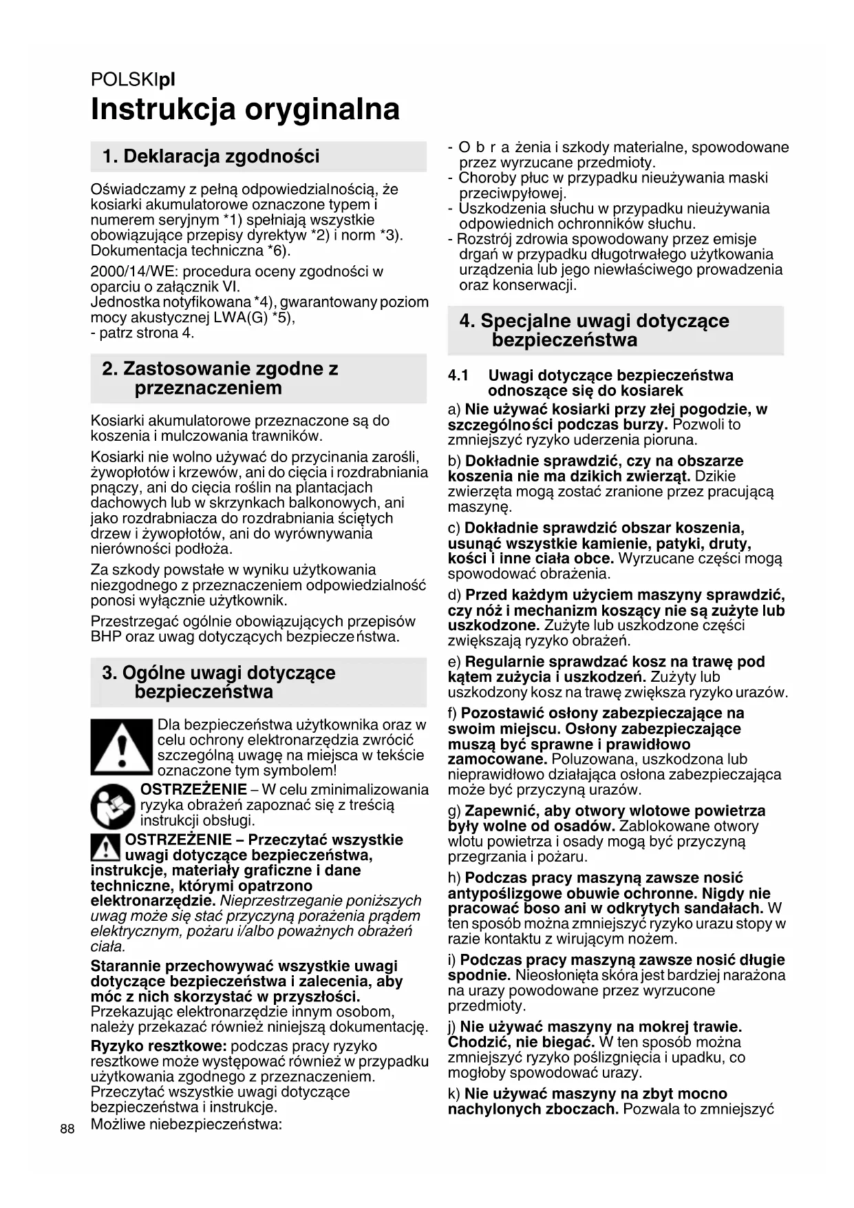 Instrukcja oryginalna Oświadczamy z pełną odpowiedzialnością, że kosiarki akumulatorowe oznaczone typem i numerem seryjnym *1) spełniają wszystkie obowiązujące przepisy dyrektyw *2) i norm *3). Dokumentacja techniczna *6). 2000/14/WE: procedura oceny zgodności w oparciu o załącznik VI. Jednostka notyfikowana *4), gwarantowany poziom mocy akustycznej LWA(G) *5), - patrz strona 4. Kosiarki akumulatorowe przeznaczone są do koszenia i mulczowania trawników. Kosiarki nie wolno używać do przycinania zarośli, żywopłotów i krzewów, ani do cięcia i rozdrabniania pnączy, ani do cięcia roślin na plantacjach dachowych lub w skrzynkach balkonowych, ani jako rozdrabniacza do rozdrabniania ściętych drzew i żywopłotów, ani do wyrównywania nierówności podłoża. Za szkody powstałe w wyniku użytkowania niezgodnego z przeznaczeniem odpowiedzialność ponosi wyłącznie użytkownik. Przestrzegać ogólnie obowiązujących przepisów BHP oraz uwag dotyczących bezpiecze ństwa. Dla bezpieczeństwa użytkownika oraz w celu ochrony elektronarzędzia zwrócić szczególną uwagę na miejsca w tekście oznaczone tym symbolem! OSTRZEŻENIE – W celu zminimalizowania ryzyka obrażeń zapoznać się z treścią instrukcji obsługi. OSTRZEŻENIE – Przeczytać wszystkie uwagi dotyczące bezpieczeństwa, instrukcje, materiały graficzne i dane techniczne, którymi opatrzono elektronarzędzie. Nieprzestrzeganie poniższych uwag może się stać przyczyną porażenia prądem elektrycznym, pożaru i/albo poważnych obrażeń ciała. Starannie przechowywać wszystkie uwagi dotyczące bezpieczeństwa i zalecenia, aby móc z nich skorzystać w przyszłości. Przekazując elektronarzędzie innym osobom, należy przekazać również niniejszą dokumentację. Ryzyko resztkowe: podczas pracy ryzyko resztkowe może występować również w przypadku użytkowania zgodnego z przeznaczeniem. Przeczytać wszystkie uwagi dotyczące bezpieczeństwa i instrukcje. Możliwe niebezpieczeństwa: -Obrażenia i szkody materialne, spowodowane przez wyrzucane przedmioty. -Choroby płuc w przypadku nieużywania maski przeciwpyłowej. -Uszkodzenia słuchu w przypadku nieużywania odpowiednich ochronników słuchu. - Rozstrój zdrowia spowodowany przez emisje drgań w przypadku długotrwałego użytkowania urządzenia lub jego niewłaściwego prowadzenia oraz konserwacji.