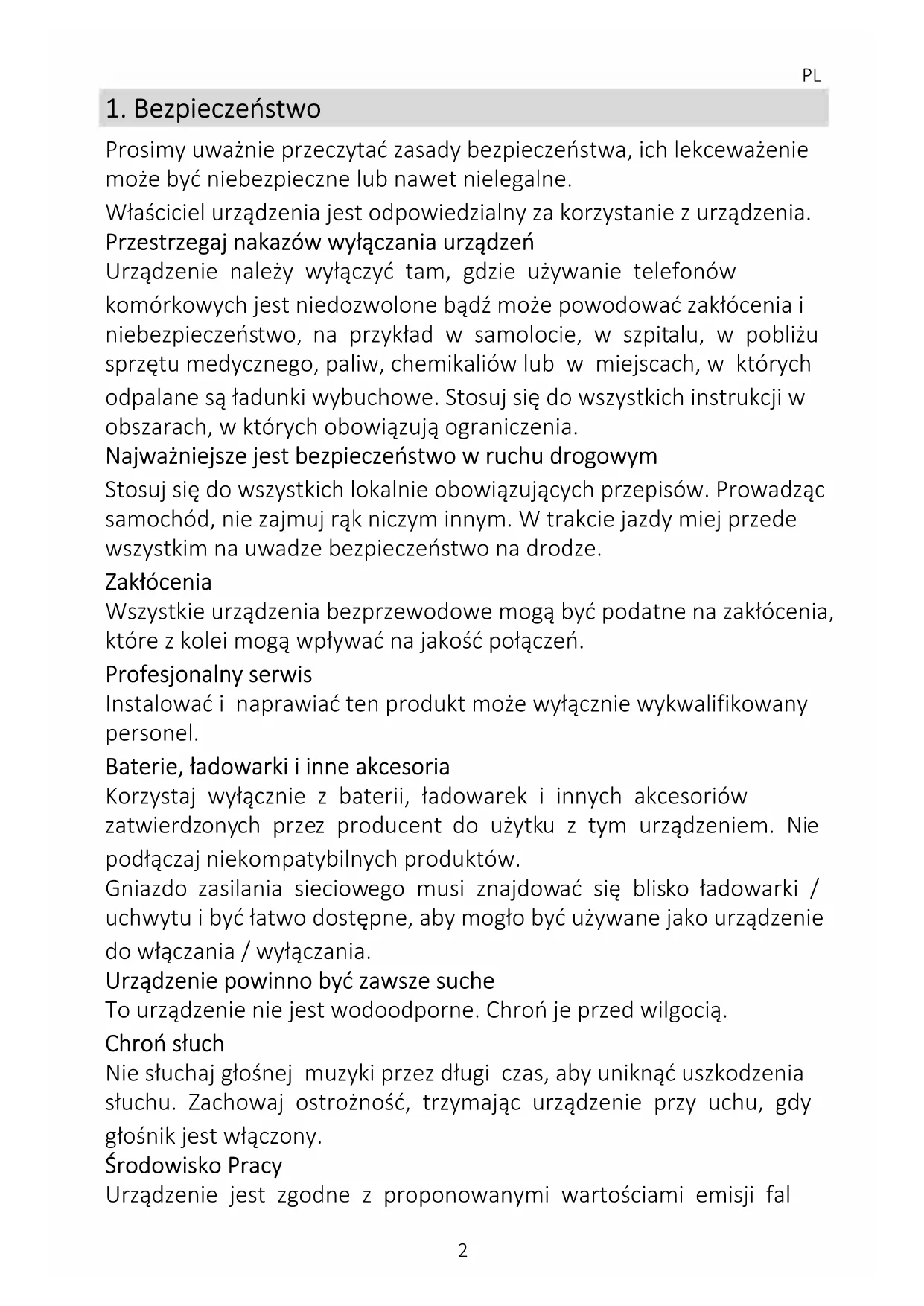 Prosimy uważnie przeczytać zasady bezpieczeństwa, ich lekceważenie może być niebezpieczne lub nawet nielegalne. Właściciel urządzenia jest odpowiedzialny za korzystanie z urządzenia. Przestrzegaj nakazów wyłączania urządzeń Urządzenie należy wyłączyć tam, gdzie używanie telefonów komórkowych jest niedozwolone bądź może powodować zakłócenia i niebezpieczeństwo, na przykład w samolocie, w szpitalu, w pobliżu sprzętu medycznego, paliw, chemikaliów lub w miejscach, w których odpalane są ładunki wybuchowe. Stosuj się do wszystkich instrukcji w obszarach, w których obowiązują ograniczenia. Najważniejsze jest bezpieczeństwo w ruchu drogowym Stosuj się do wszystkich lokalnie obowiązujących przepisów. Prowadząc samochód, nie zajmuj rąk niczym innym. W trakcie jazdy miej przede wszystkim na uwadze bezpieczeństwo na drodze. Zakłócenia Wszystkie urządzenia bezprzewodowe mogą być podatne na zakłócenia, które z kolei mogą wpływać na jakość połączeń. Profesjonalny serwis Instalować i naprawiać ten produkt może wyłącznie wykwalifikowany personel. Baterie, ładowarki i inne akcesoria Korzystaj wyłącznie z baterii, ładowarek i innych akcesoriów zatwierdzonych przez producent do użytku z tym urządzeniem. Nie podłączaj niekompatybilnych produktów. Gniazdo zasilania sieciowego musi znajdować się blisko ładowarki / uchwytu i być łatwo dostępne, aby mogło być używane jako urządzenie do włączania / wyłączania. Urządzenie powinno być zawsze suche To urządzenie nie jest wodoodporne. Chroń je przed wilgocią. Chroń słuch Nie słuchaj głośnej muzyki przez długi czas, aby uniknąć uszkodzenia słuchu. Zachowaj ostrożność, trzymając urządzenie przy uchu, gdy głośnik jest włączony. Środowisko Pracy Urządzenie jest zgodne z proponowanymi wartościami emisji falPL