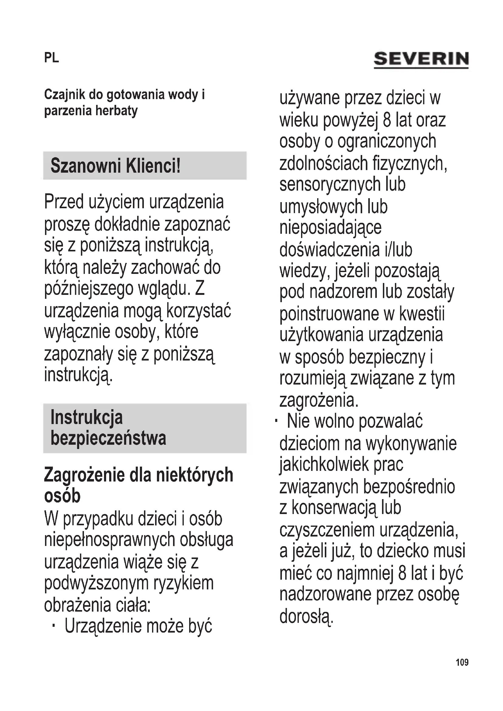Czajnik do gotowania wody i parzenia herbaty Szanowni Klienci! Przed użyciem urządzenia proszę dokładnie zapoznać się z poniższą instrukcją, którą należy zachować do późniejszego wglądu. Z urządzenia mogą korzystać wyłącznie osoby, które zapoznały się z poniższą instrukcją. Instrukcja bezpieczeństwa Zagrożenie dla niektórych osób W przypadku dzieci i osób niepełnosprawnych obsługa urządzenia wiąże się z podwyższonym ryzykiem obrażenia ciała