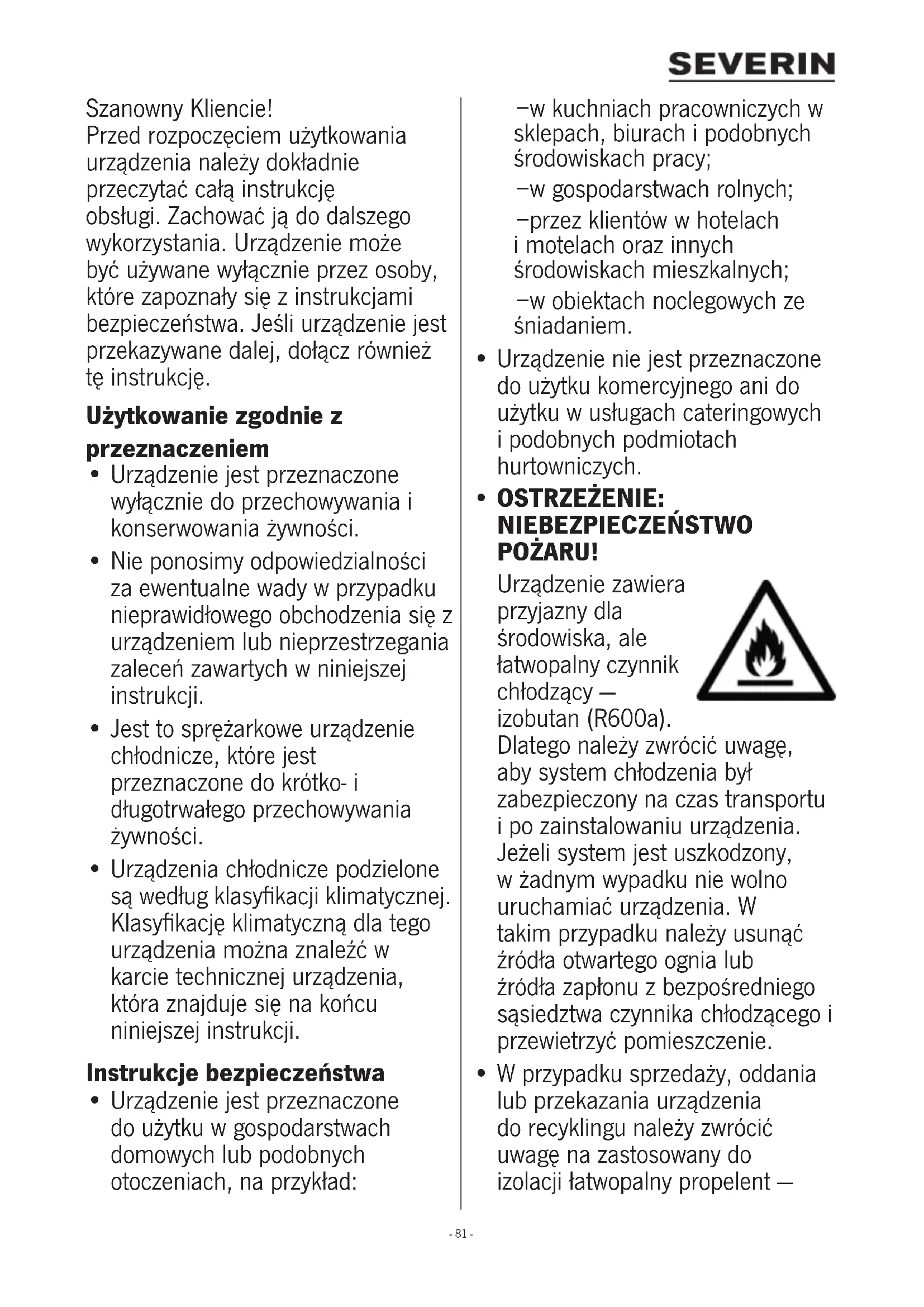 - W przypadku sprzedaży, oddania lub przekazania urządzenia do recyklingu należy zwrócić uwagę na zastosowany do izolacji łatwopalny propelent —- 82 - cyklopentan (C