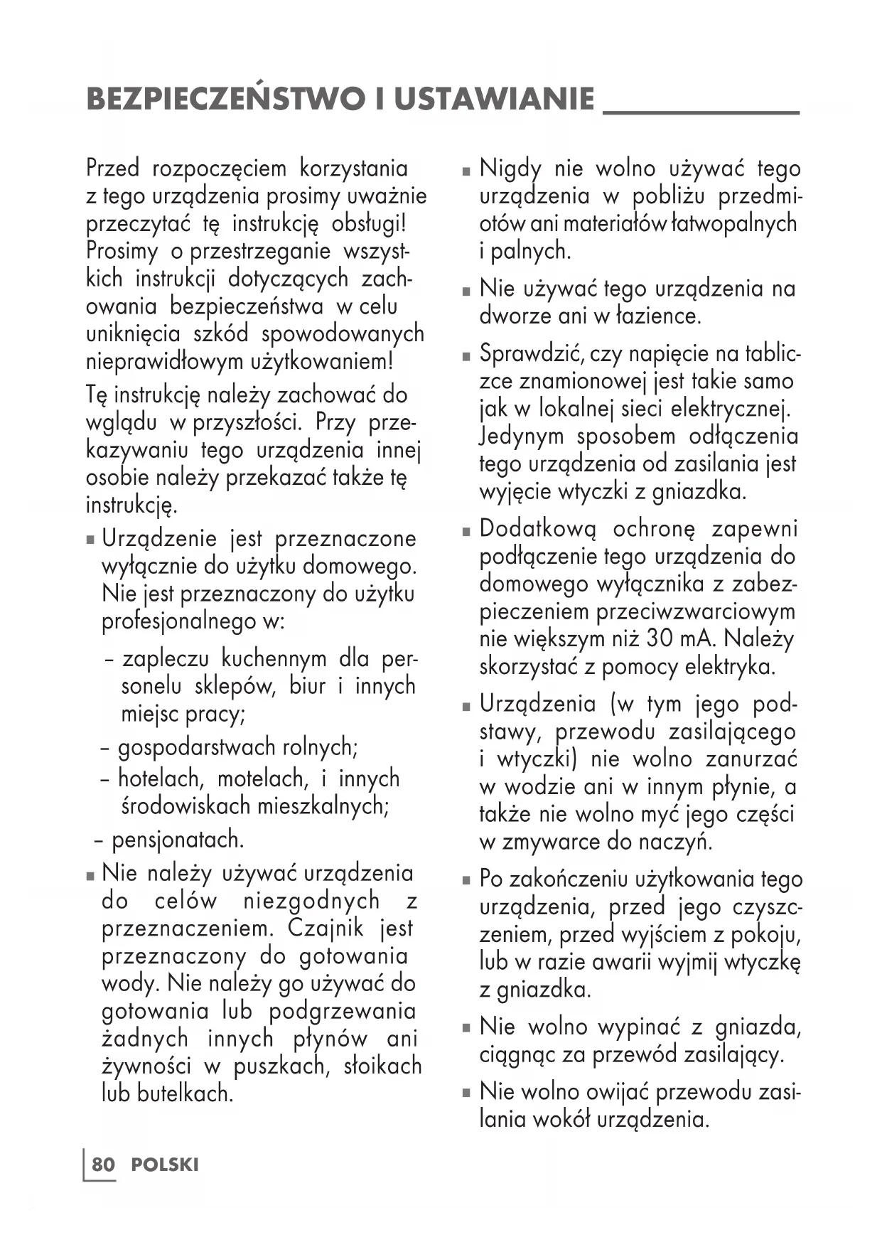 Nie należy używać urządzenia do celów niezgodnych z przeznaczeniem. Czajnik jest przeznaczony do gotowania wody. Nie należy go używać do gotowania lub podgrzewania żadnych innych płynów ani żywności w puszkach, słoikach lub butelkach.