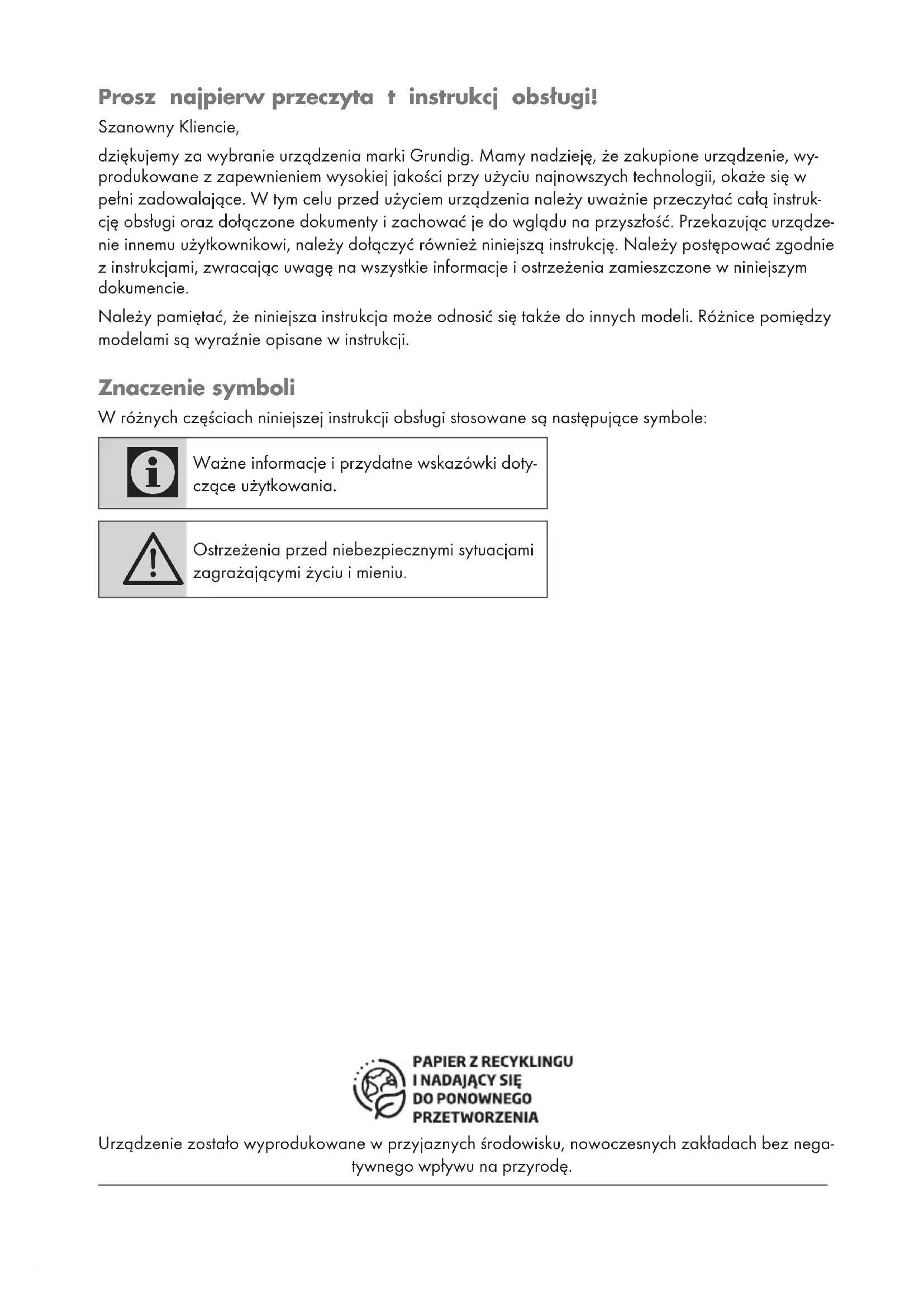 Zgodność z dyrektywą WEEE i usu- wanie odpadów: Niniejszy wyrób jest zgodny z dyrektywą Parla- mentu Europejskiego i Rady (2012/19/WE). Wyrób ten oznaczony jest symbolem klasyfikacji zużytych urządzeń elektrycznych i elektronicznych (WEEE). Ten symbol oznacza, że sprzęt nie może być umieszczany łącznie z innymi odp- adami gospodarstwa domowego po okresie jego użytkowania. Zużyte urządzenie należy oddać do specjalne- go punktu zbiórki zużytego sprzętu elek- trycznego i elektronicznego w celu utylizacji. Aby uzyskać informacje o punktach zbiórki w swojej okolicy należy skontaktować się z lokalnymi władzami lub punktem sprzedaży tego produktu. Gospodarstwo domowe spełnia ważną rolę w przyczynianiu się do ponownego użycia i odzysku zużytego sprzętu. Odpowiednie postępowanie ze zużytym sprzętem zapobiega potencjalnym negatywnym konsekwencjom dla środowiska naturalnego i ludzkiego zdrowia. Zgodność z dyrektywą RoHS: Niniejszy wyrób jest zgodny z dyrektywą Parlamentu Europejskiego i Rady RoHS (Ograniczenie użycia sub- stancji niebezpiecznych) (2011/65/WE). Nie zawiera szkodliwych i zakazanych materiałów, podanych w tej dyrektywie. Informacje o opakowaniu Opakowanie tego wyrobu wykonano z materiałów nadających się do recyklingu, zgodnie z naszym ustawodawstwem kra- jowym. Nie wyrzucaj materiałów opakow- aniowych do śmieci wraz z innymi odpadkami domow- ymi. Oddaj je w jednym z wyznaczonych przez władze lokalne punktów zbiórki materiałów opakow- aniowych. INFORMACJE ________________________________ Dane techniczne Urządzenie to pracuje bez zakłóceń radiowych zgodnie z obowiązującymi dyrektywami UE. Urządzenie to pracuje bez zakłóceń radiowych zgodnie z obowiązującymi dyrektywami UE. Produkt spełnia wymagania dyrektyw europejskich 2014/53/EU, 2009/125/EC i 2011/65/EU. Nie wolno otwierać obudowy urządzenia. Producent nie odpowiada za szkody spowodowane nieprawidłowym posługiwaniem się tym urządzeniem. Deklarację zgodności CE dla tego urządzenia można teraz znaleźć w postaci pliku pdf w witrynie internetowej firmy Grundig www.grundig.com/downloads/doc. Tabliczka znamionowa jest umieszczona na spodzie urządzenia. Zasilanie Zasilanie z sieci: 230 V