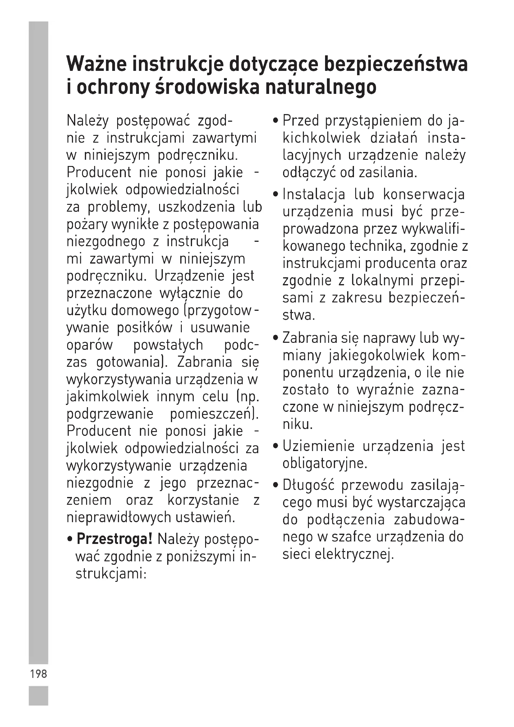 Producent powierzchni zasysają- cej nie ponosi jakiejkolwiek odpowie- dzialności za wszelkie niedogodności, uszkodzenia lub pożary spowodowane usterkami i/lub awariami i/lub niepra