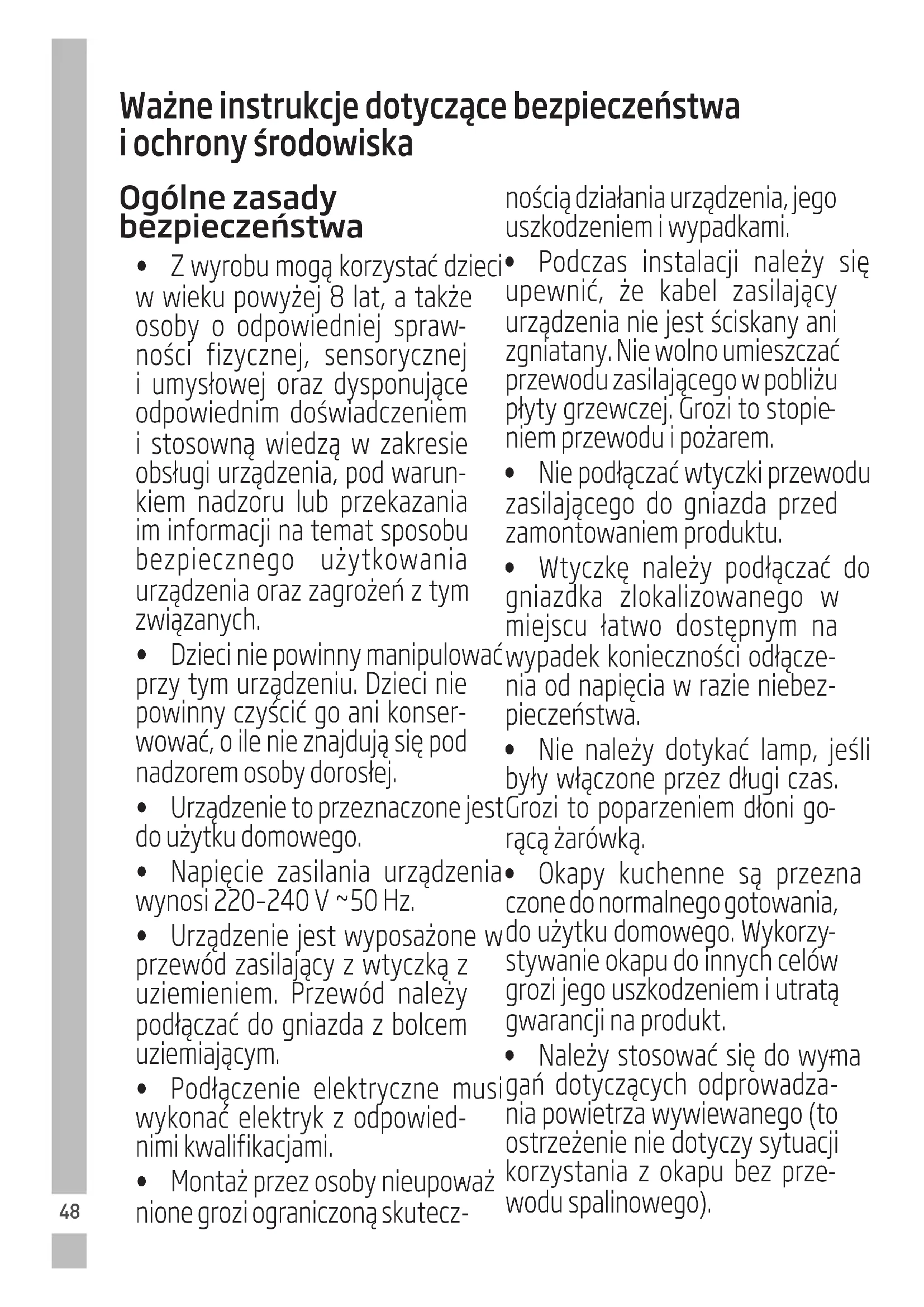 - Podciśnienie w otoczeniu nie może przekraczać 4 Pa (4 × 10 barów) przy równoczesnym działaniu okapu nad elektryczną płytą grzewczą i urządzeń AGD zasilanych elektrycznie prądem o innych parametrach.