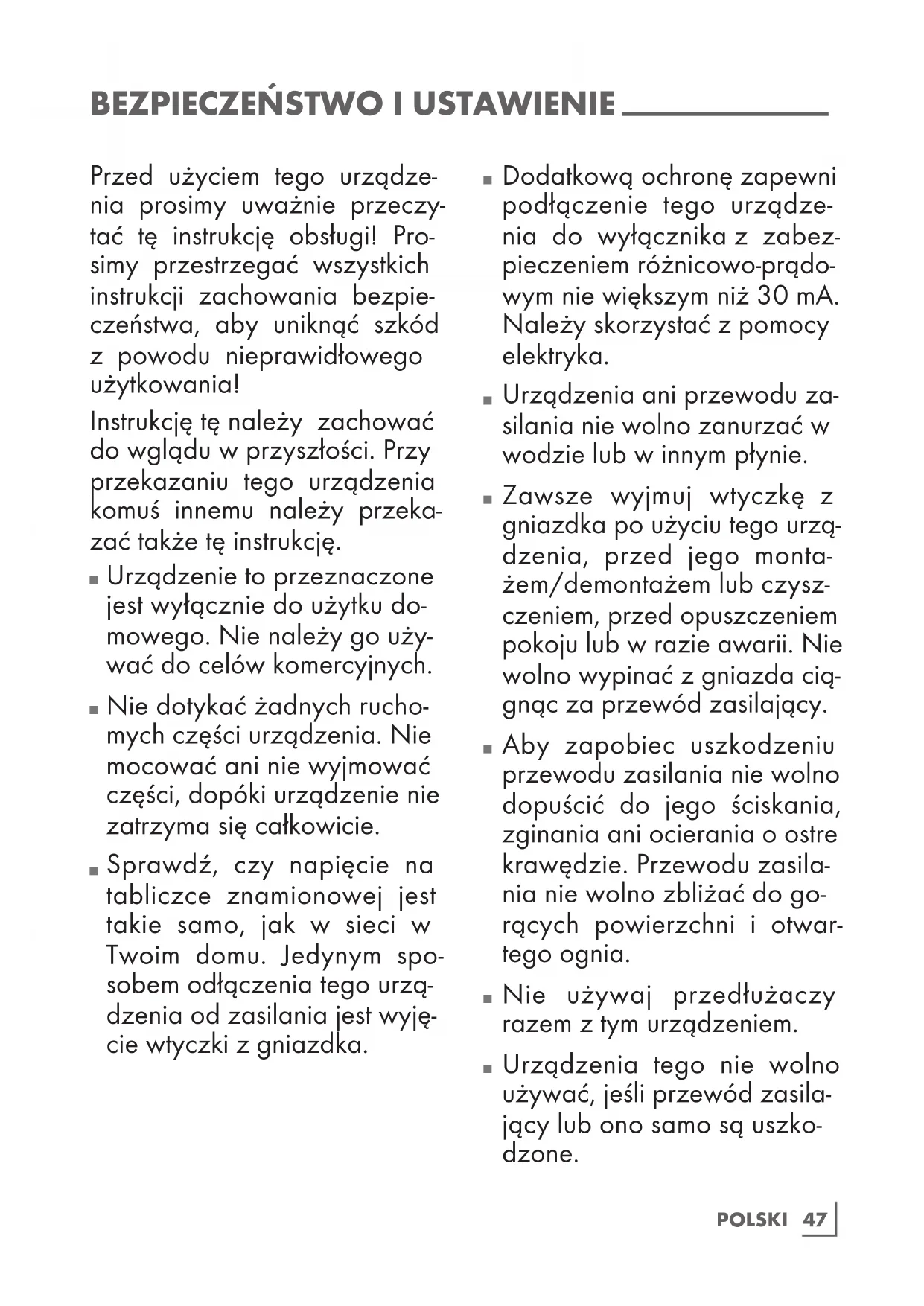 Przed użyciem tego urządze- nia prosimy uważnie przeczy- tać tę instrukcję obsługi! Pro- simy przestrzegać wszystkich instrukcji zachowania bezpie- czeństwa, aby uniknąć szkód z powodu nieprawidłowego użytkowania! Instrukcję tę należy zachować do wglądu w przyszłości. Przy przekazaniu tego urządzenia komuś innemu należy przeka- zać także tę instrukcję.