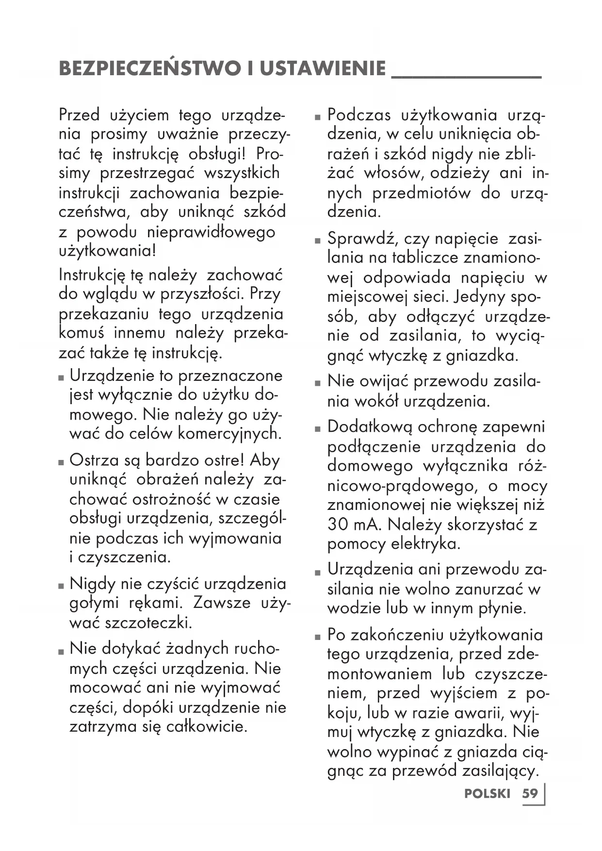 Podczas użytkowania urzą- dzenia, w celu uniknięcia ob- rażeń i szkód nigdy nie zbli- żać włosów, odzieży ani in- nych przedmiotów do urzą- dzenia.