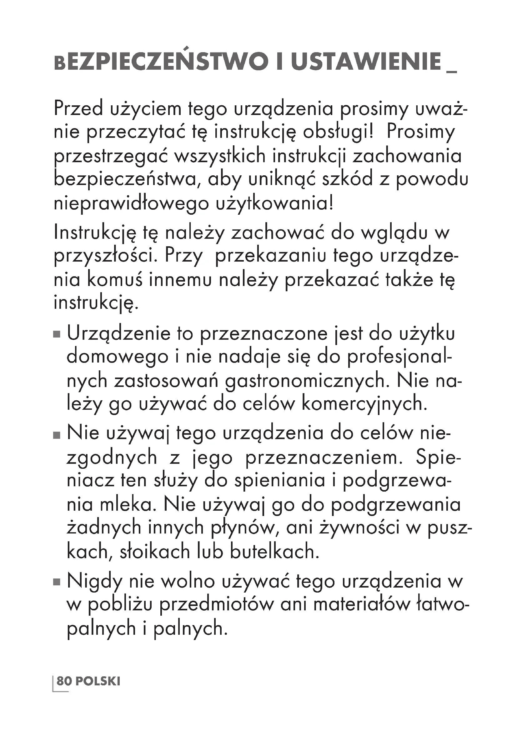 Nie używaj tego urządzenia do celów nie- zgodnych z jego przeznaczeniem. Spie- niacz ten służy do spieniania i podgrzewa- nia mleka. Nie używaj go do podgrzewania żadnych innych płynów, ani żywności w pusz- kach, słoikach lub butelkach.