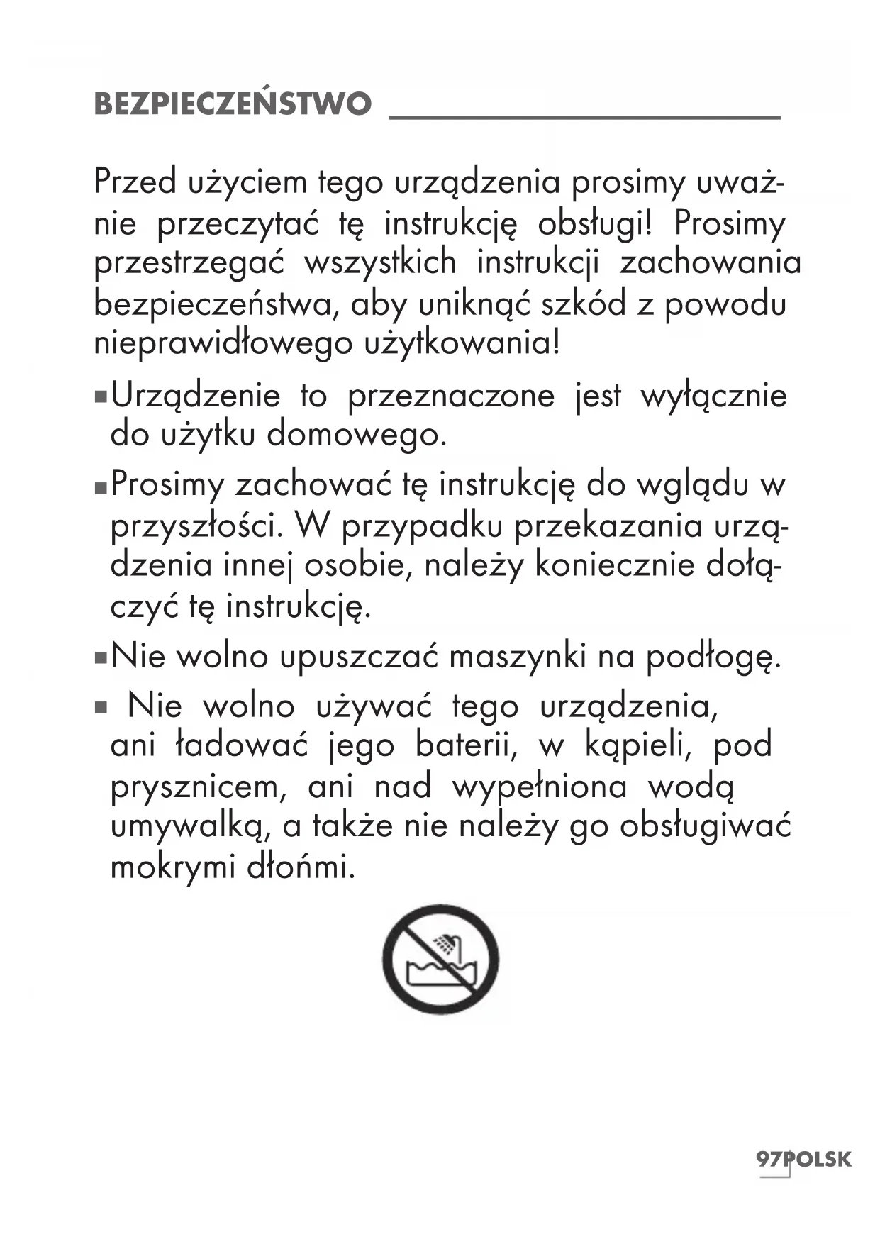 Nie wolno używać tego urządzenia, ani ładować jego baterii, w kąpieli, pod prysznicem, ani nad wypełniona wodą umywalką, a także nie należy go obsługiwać mokrymi dłońmi.98 POLSKI BEZPIECZEŃSTWO ________________________