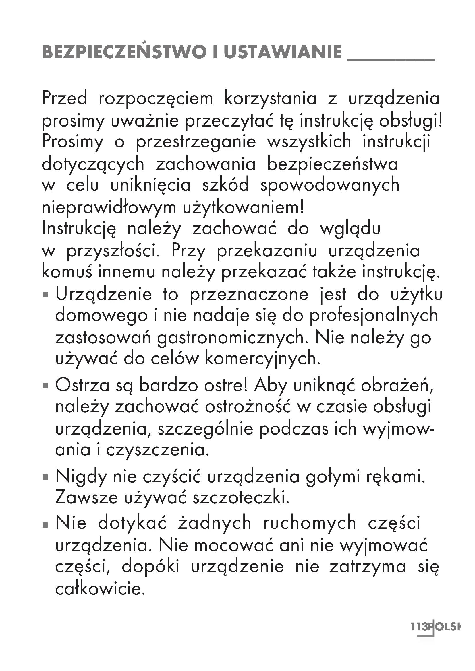 Ostrza są bardzo ostre! Aby uniknąć obrażeń, należy zachować ostrożność w czasie obsługi urządzenia, szczególnie podczas ich wyjmow- ania i czyszczenia.