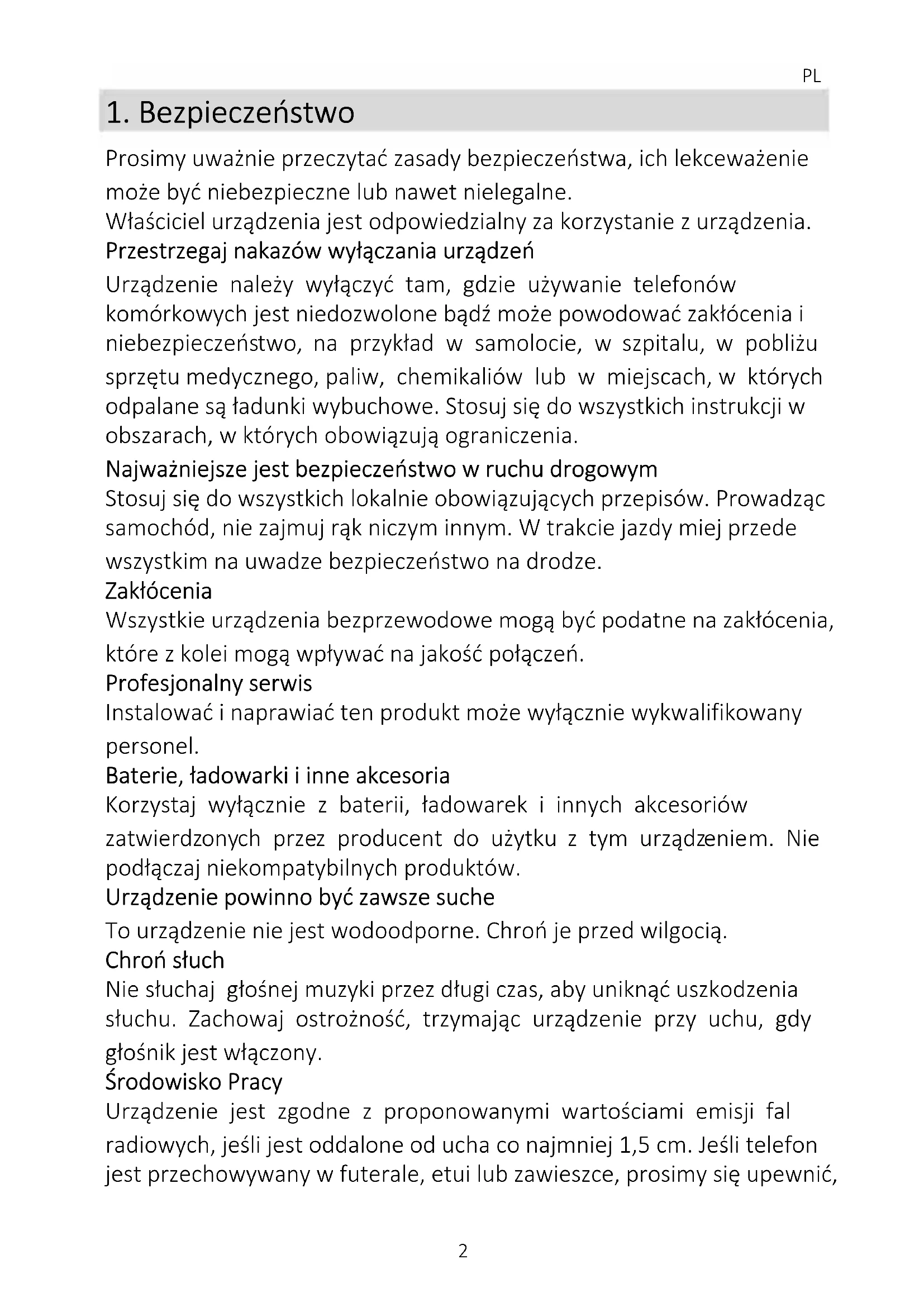 Prosimy uważnie przeczytać zasady bezpieczeństwa, ich lekceważenie może być niebezpieczne lub nawet nielegalne. Właściciel urządzenia jest odpowiedzialny za korzystanie z urządzenia. Przestrzegaj nakazów wyłączania urządzeń Urządzenie należy wyłączyć tam, gdzie używanie telefonów komórkowych jest niedozwolone bądź może powodować zakłócenia i niebezpieczeństwo, na przykład w samolocie, w szpitalu, w pobliżu sprzętu medycznego, paliw, chemikaliów lub w miejscach, w których odpalane są ładunki wybuchowe. Stosuj się do wszystkich instrukcji w obszarach, w których obowiązują ograniczenia. Najważniejsze jest bezpieczeństwo w ruchu drogowym Stosuj się do wszystkich lokalnie obowiązujących przepisów. Prowadząc samochód, nie zajmuj rąk niczym innym. W trakcie jazdy miej przede wszystkim na uwadze bezpieczeństwo na drodze. Zakłócenia Wszystkie urządzenia bezprzewodowe mogą być podatne na zakłócenia, które z kolei mogą wpływać na jakość połączeń. Profesjonalny serwis Instalować i naprawiać ten produkt może wyłącznie wykwalifikowany personel. Baterie, ładowarki i inne akcesoria Korzystaj wyłącznie z baterii, ładowarek i innych akcesoriów zatwierdzonych przez producent do użytku z tym urządzeniem. Nie podłączaj niekompatybilnych produktów. Urządzenie powinno być zawsze suche To urządzenie nie jest wodoodporne. Chroń je przed wilgocią. Chroń słuch Nie słuchaj głośnej muzyki przez długi czas, aby uniknąć uszkodzenia słuchu. Zachowaj ostrożność, trzymając urządzenie przy uchu, gdy głośnik jest włączony. Środowisko Pracy Urządzenie jest zgodne z proponowanymi wartościami emisji fal radiowych, jeśli jest oddalone od ucha co najmniej 1,5 cm. Jeśli telefon jest przechowywany w futerale, etui lub zawieszce, prosimy się upewnić,PL