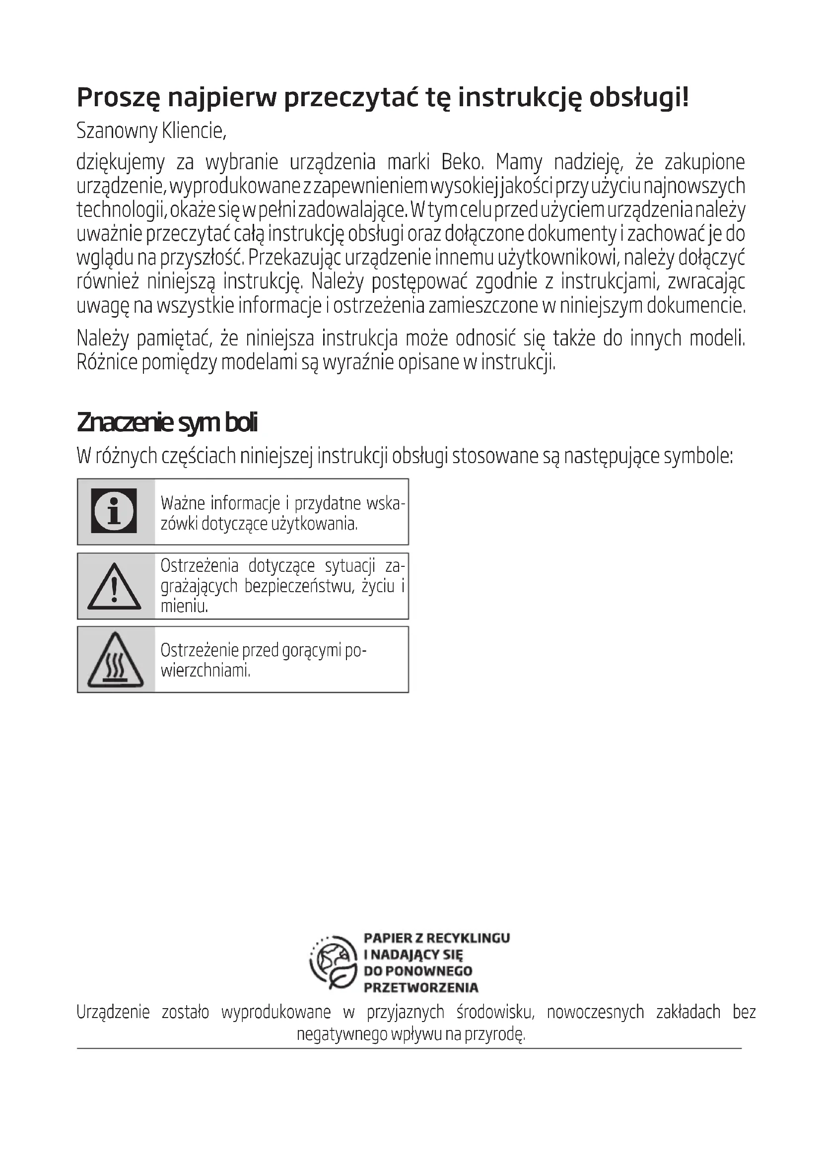 - Vervoer het product in de normale positie. Leun niet tegen ze zijkant of achterkant.Proszę najpierw przeczytać tę instrukcję obsługi! Szanowny Kliencie, dziękujemy za wybranie urządzenia marki Beko. Mamy nadzieję, że zakupione urządzenie, wyprodukowane z zapewnieniem wysokiej jakości przy użyciu najnowszych technologii, okaże się w pełni zadowalające. W tym celu przed użyciem urządzenia należy uważnie przeczytać całą instrukcję obsługi oraz dołączone dokumenty i zachować je do wglądu na przyszłość. Przekazując urządzenie innemu użytkownikowi, należy dołączyć również niniejszą instrukcję. Należy postępować zgodnie z instrukcjami, zwracając uwagę na wszystkie informacje i ostrzeżenia zamieszczone w niniejszym dokumencie. Należy pamiętać, że niniejsza instrukcja może odnosić się także do innych modeli. Różnice pomiędzy modelami są wyraźnie opisane w instrukcji. Znaczenie sym boli W różnych częściach niniejszej instrukcji obsługi stosowane są następujące symbole: