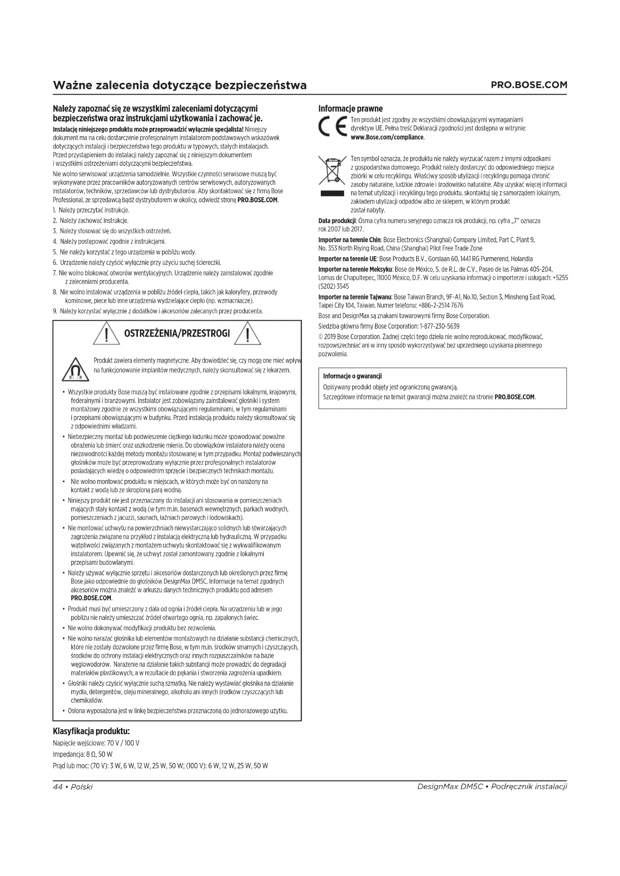 Informacje prawne Ten produkt jest zgodny zewszystkimi obowiązującymi wymaganiami dyrektyw UE. Pełna treść Deklaracji zgodności jest dostępna wwitrynie: www.Bose.com/compliance. Ten symbol oznacza, że produktu nie należy wyrzucać razem zinnymi odpadkami zgospodarstwa domowego. Produkt należy dostarczyć do odpowiedniego miejsca zbiórki wcelu recyklingu. Właściwy sposób utylizacji irecyklingu pomaga chronić zasoby naturalne, ludzkie zdrowie iśrodowisko naturalne. Aby uzyskać więcej informacji na temat utylizacji irecyklingu tego produktu, skontaktuj się zsamorządem lokalnym, zakładem utylizacji odpadów albo ze sklepem, wktórym produkt został nabyty. Data produkcji: Ósma cyfra numeru seryjnego oznacza rok produkcji, np. cyfra „7” oznacza rok 2007 lub 2017. Importer na terenie Chin: Bose Electronics (Shanghai) Company Limited, Part C, Plant 9, No. 353 North Riying Road, China (Shanghai) Pilot Free Trade Zone Importer na terenie UE: Bose Products B.V., Gorslaan 60, 1441 RG Purmerend, Holandia Importer na terenie Meksyku: Bose de México, S. de R.L. de C.V., Paseo de las Palmas 405-204, Lomas de Chapultepec, 11000 México, D.F. W celu uzyskania informacji oimporterze iusługach: +5255 (5202) 3545 Importer na terenie Tajwanu: Bose Taiwan Branch, 9F-A1, No.10, Section 3, Minsheng East Road, Taipei City 104, Taiwan. Numer telefonu: +886-2-2514 7676 Bose and DesignMax są znakami towarowymi firmy Bose Corporation. Siedziba główna firmy Bose Corporation: 1-877-230-5639 © 2019 Bose Corporation. Żadnej części tego dzieła nie wolno reprodukować, modyfikować, rozpowszechniać ani winny sposób wykorzystywać bez uprzedniego uzyskania pisemnego pozwolenia. Informacje ogwarancji Opisywany produkt objęty jest ograniczoną gwarancją. Szczegółowe informacje na temat gwarancji można znaleźć na stronie PRO.BOSE.COM. Klasyfikacja produktu: Napięcie wejściowe: 70V / 100V Impedancja: 8Ω, 50W Prąd lub moc: (70V): 3W, 6W, 12W, 25W, 50W; (100V): 6W, 12W, 25W, 50W
