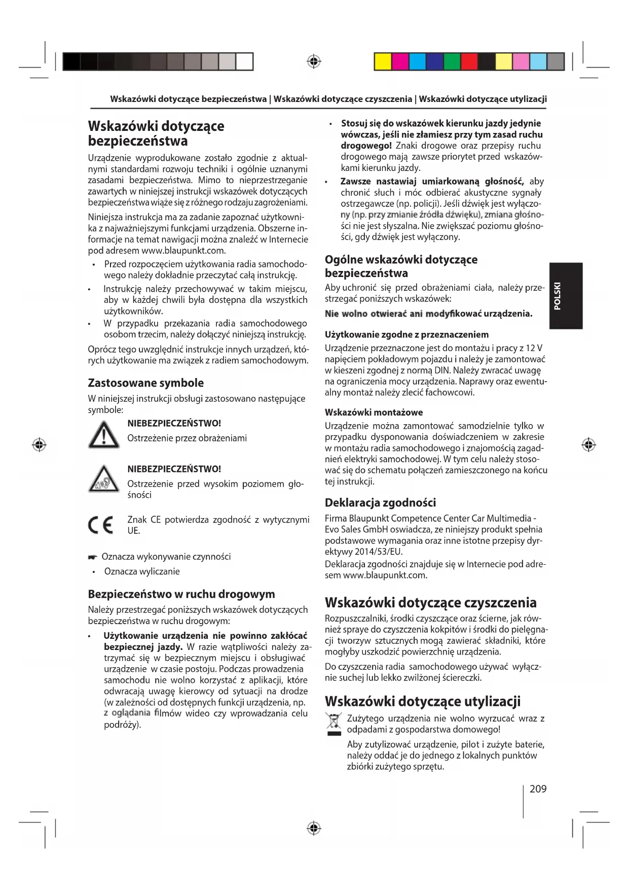 - Załącznik 208Wskazówki dotyczące bezpieczeństwa | Wskazówki dotyczące czyszczenia | Wskazówki dotyczące utylizacji Wskazówki dotyczące bezpieczeństwa Urządzenie wyprodukowane zostało zgodnie z aktual- nymi standardami rozwoju techniki i ogólnie uznanymi zasadami bezpieczeństwa. Mimo to nieprzestrzeganie zawartych w niniejszej instrukcji wskazówek dotyczących bezpieczeństwa wiąże się z różnego rodzaju zagrożeniami. Niniejsza instrukcja ma za zadanie zapoznać użytkowni- ka z najważniejszymi funkcjami urządzenia. Obszerne in- formacje na temat nawigacji można znaleźć w Internecie pod adresem www.blaupunkt.com. p. 314