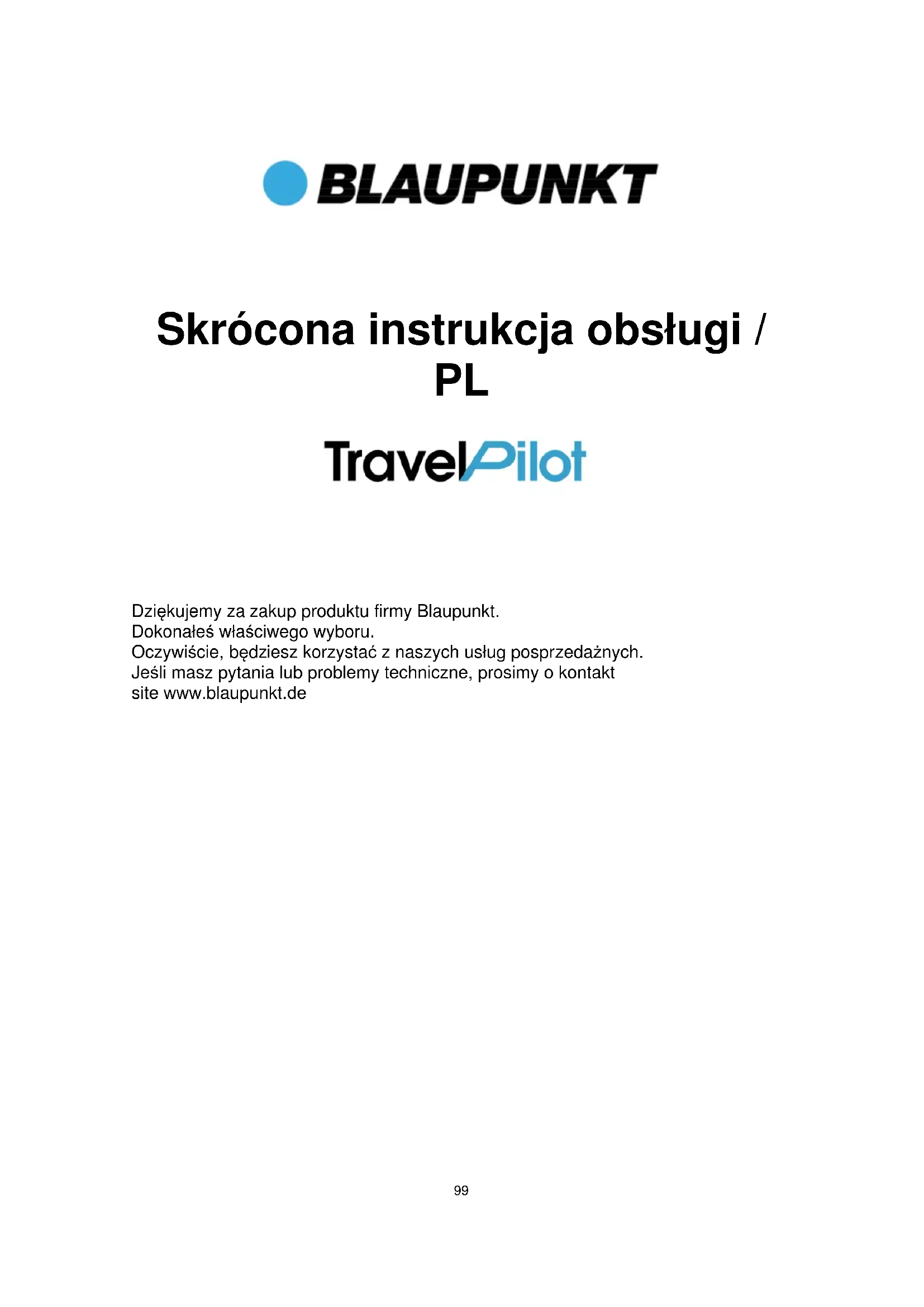 Dziękujemy za zakup produktu firmy Blaupunkt. Dokonałeś właściwego wyboru. Oczywiście, będziesz korzystać z naszych usług posprzedażnych. Jeśli masz pytania lub problemy techniczne, prosimy o kontakt site www.blaupunkt.de100 Szanowni Państwo, Dziękujemy za korzystanie z urządz enia nawigacyjnego firmy Blaupunkt.