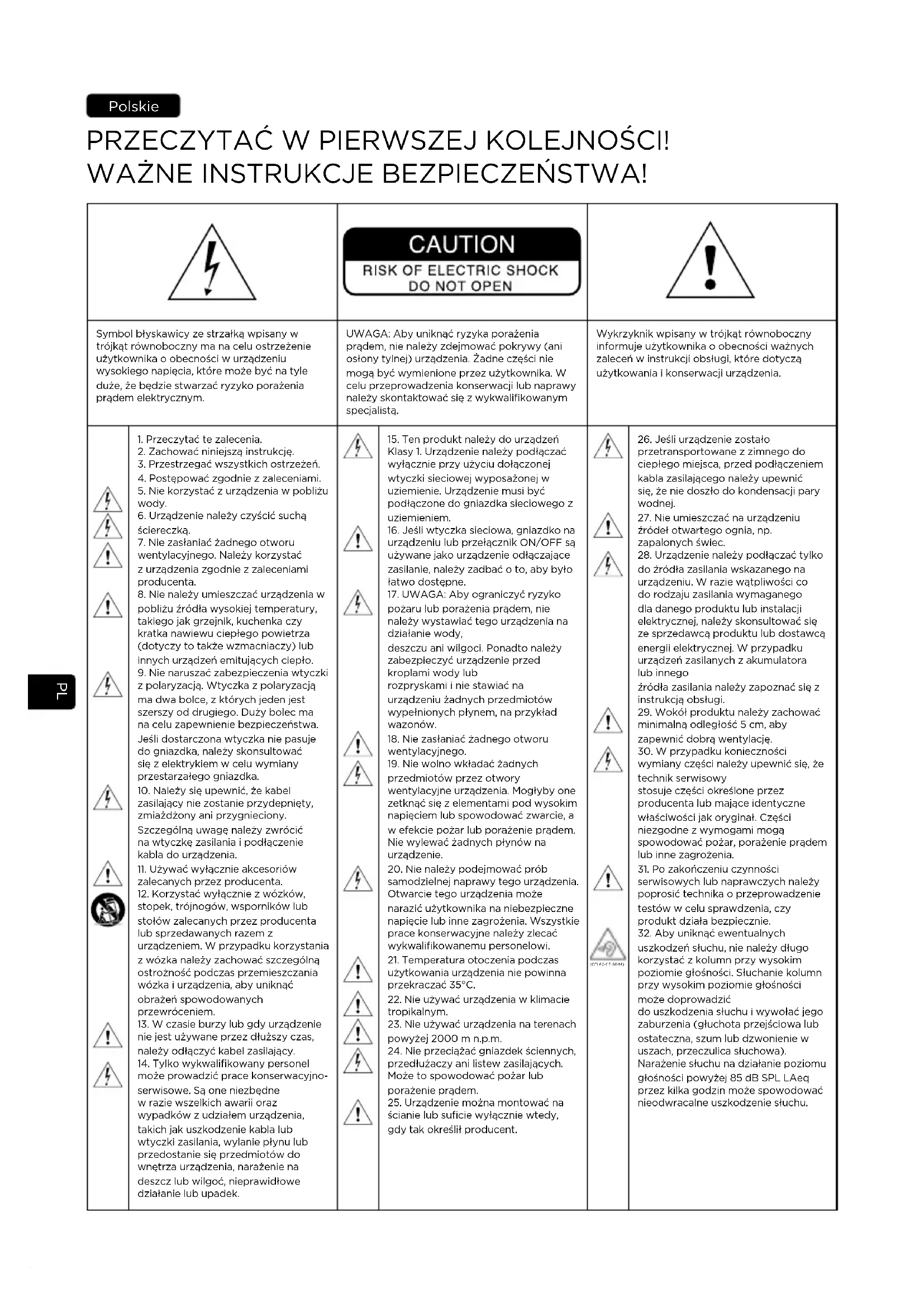 - Gewicht 5,95 kg (13.1 lbs) 7,6 kg (16.8 lbs)PL PRZECZYTAĆ W PIERWSZEJ KOLEJNOŚCI! WAŻNE INSTRUKCJE BEZPIECZEŃSTWA! Polskie Symbol błyskawicy ze strzałką wpisany w trójkąt równoboczny ma na celu ostrzeżenie użytkownika o obecności w urządzeniu wysokiego napięcia, które może być na tyle duże, że będzie stwarzać ryzyko porażenia prądem elektrycznym. UWAGA: Aby uniknąć ryzyka porażenia prądem, nie należy zdejmować pokrywy (ani osłony tylnej) urządzenia. Żadne części nie mogą być wymienione przez użytkownika. W celu przeprowadzenia konserwacji lub naprawy należy skontaktować się z wykwalifikowanym specjalistą. Wykrzyknik wpisany w trójkąt równoboczny informuje użytkownika o obecności ważnych zaleceń w instrukcji obsługi, które dotyczą użytkowania i konserwacji urządzenia.