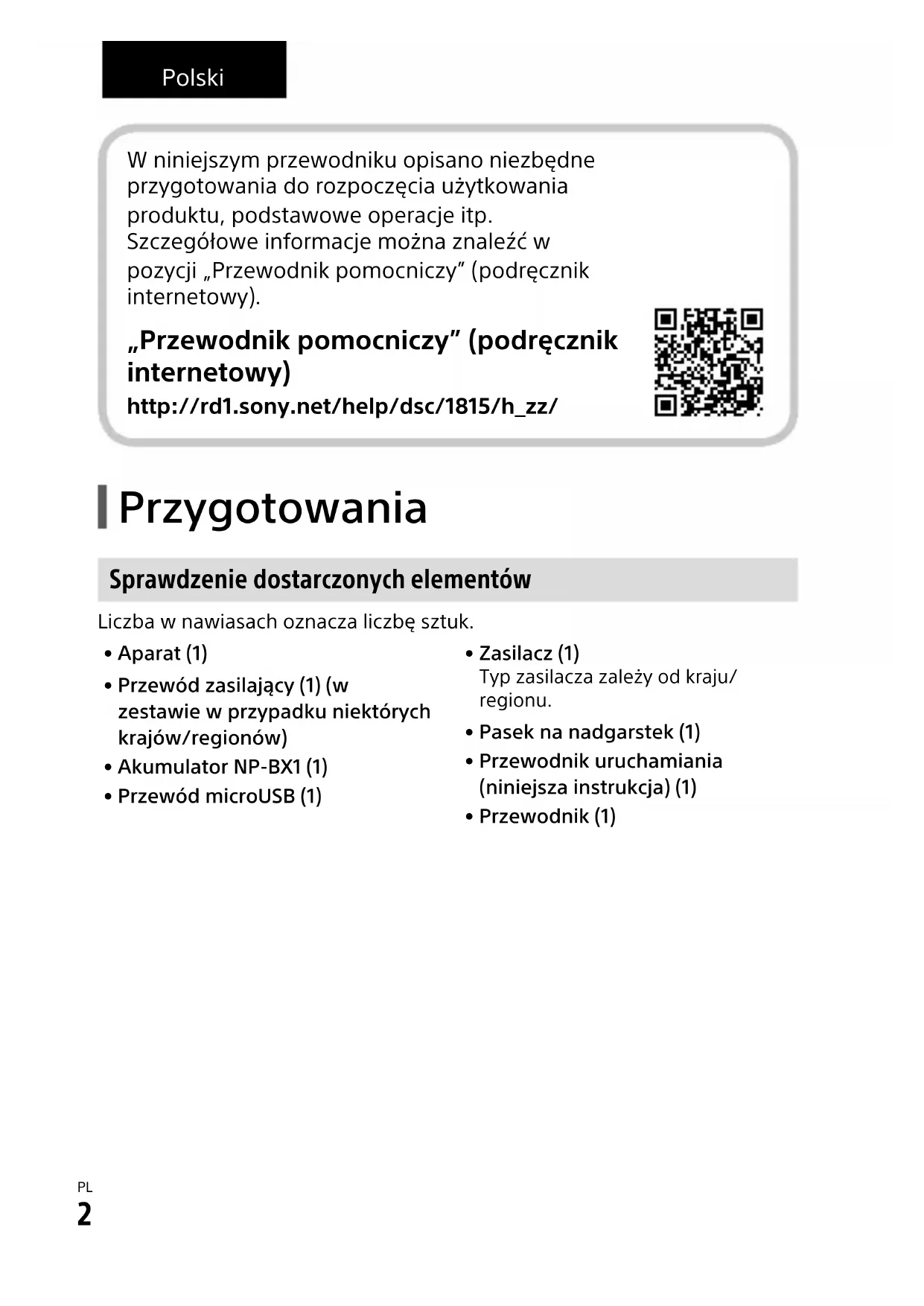 \\Win-473\camera\CX64400(ZLC)\Multi\06_Compose\4746011311_15lang\4746011311DSCHX99CE3\08PL-DSCHX99CE3\08PL.indd DTP data saved: 2018/08/20 09:12 PDF file created: 2018/08/30 10:27 Polski Przygotowania Sprawdzenie dostarczonych elementów Liczba w nawiasach oznacza liczbę sztuk.• Aparat (1)• Przewód zasilający (1) (w zestawie wprzypadku niektórych krajów/regionów)• Akumulator NP-BX1 (1)• Przewód microUSB (1)• Zasilacz (1)Typ zasilacza zależy od kraju/regionu.• Pasek na nadgarstek (1)• Przewodnik uruchamiania (niniejsza instrukcja) (1)• Przewodnik (1) W niniejszym przewodniku opisano niezbędne przygotowania do rozpoczęcia użytkowania produktu, podstawowe operacje itp. Szczegółowe informacje można znaleźć w pozycji „Przewodnik pomocniczy” (podręcznik internetowy). „Przewodnik pomocniczy” (podręcznik internetowy) http://rd1.sony.net/help/dsc/1815/h_zz/DSC-HX99/DSC-HX95/DSC-WX800/DSC-WX7004-746-011-31(1)