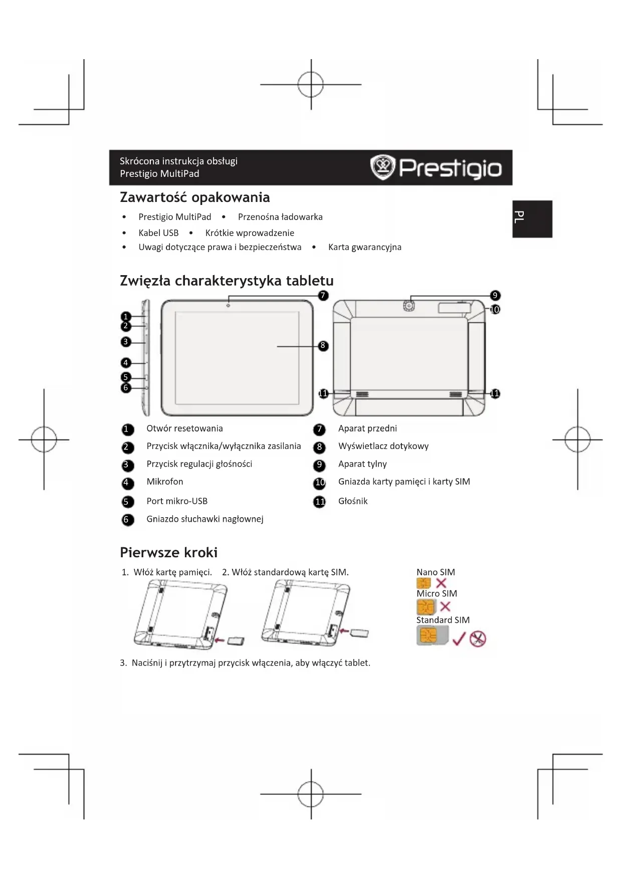 - Naciśnijprzyciskwłączenialubgłośności,abywyciszyćdźwiękbezodrzucaniapołączenia. Połączenie z Internetem PołączsięzInternetempoprzezsiećWi-Filubsiećprzesyłudanychoperatora. Łączenie z siecią bezprzewodową 1.DotknijikonySettings(Ustawienia)naekraniestartowymlubmenulistyiwłączsiećWi-Fi. 2.NaliściepojawiąsięwykrytesieciWi-Fi.Dotknijwybranejsieci. 3.DotknijprzyciskuConnect(Połącz).Podajhasłodosieciwraziekonieczności. Włączanie przesyłu danych 1.DotknijikonySettings(Ustawienia)>More... (Więcej...)>Mobile networks (Siecimobilne)> Data enabled(Włączeniedanych). 2.Włączprzesyłdanych. SiećWi-FiiprzesyłdanychmożnarównieżwłączyćwmenuQuickSettings(Szybkie ustawienia).Abyuzyskaćdoniegodostęp,przesuńpalcemwdółzprawegogórnego narożnikaekranustartowego. Dane techniczne Element Dane techniczne Procesor QuadCoreMSM8212CortexA7 Pamięć 8GBFlash+1GBLPDDR2,gniazdomicroSDobsługujedo32GB System operacyjny Android4.3,JellyBean Częstotliwość 1,2GHz GPU Adreno302,do400MhzPL Skrócona instrukcja obsługi Prestigio MultiPad Wyświetlacz 8”4:3IPS,pojemnościowypanelMultiTouch(obsługujedo5punktów) Rozdzielczość 1024x768pikseli Pasmo WCDMA+GSM(WCDMA:900/2100;GSM:850/900/1800/1900) Interfejsy MicroUSB2.0,microSD(zgodnośćzmicroSDHC) Komunikacja Wi-Fi(802.11b/g/n) Bluetooth Bluetooth4.0 Aparat Przód0,3Mpx,tył2,0Mpx GPS Obsługa Akumulator Akumulatorlitowo-polimerowyopojemności4300mAh Wymiary 202x154x9,95mm Waga 430g(wprzybliżeniu) Współczynnik absorpcji swoistej NajwyższawartośćSARzarejestrowanadlatelefonuPMT3287_3Gpodczassprawdzaniajego zgodnościznormąwynosiła 0.509W/kg(10g),zgodniezzaleceniamiICNIRP. PonieważwyrobyfirmyPrestigiosąnabieżącounowocześnianeidoskonalone, wyglądlubfunkcjonalnośćzainstalowanegooprogramowaniai/lubkomponentów sprzętowychmożeodbiegaćodopisówprzedstawionychwniniejszej„Skróconej instrukcjiobsługi”. FirmaPrestigiooświadcza,żeprzedmiotowywyróbspełniapodstawowewymogiijestzgodny zinnymiistotnymiuregulowaniamiDyrektywy1999/5/WE.Pełnadeklaracjazgodnościjest dostępnanastroniehttp://www.prestigio.com/compliance. Byuniknąćpotencjalnegouszkodzeniasłuchu,należyunikaćdłuższejekspozycjina głośnedźwięki.PT Guia de introdução Prestigio MultiPad Conteúdo da embalagem