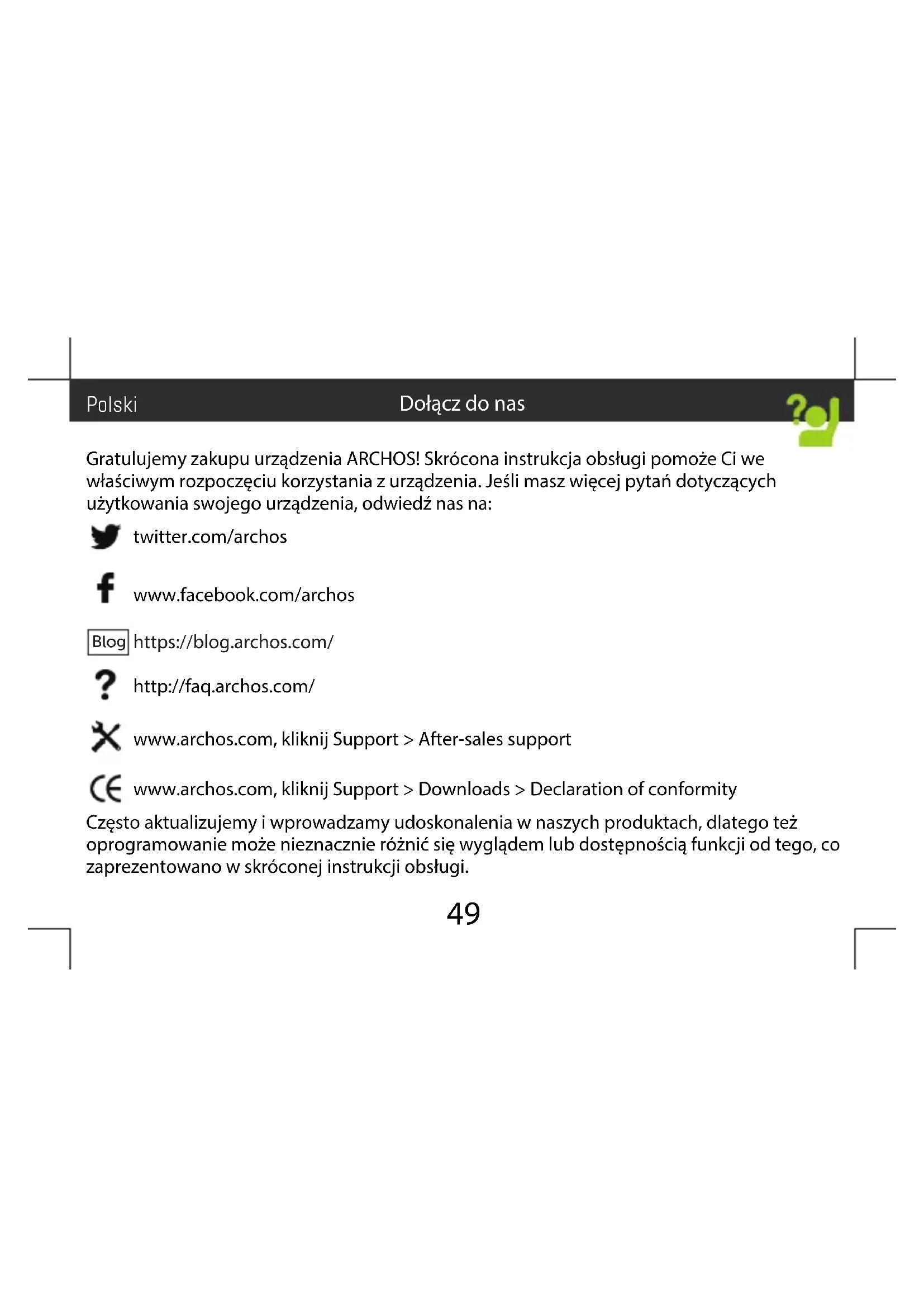 Gratulujemy zakupu urządzenia ARCHOS! Skrócona instrukcja obsługi pomoże Ci we właściwym rozpoczęciu korzystania z urządzenia. Jeśli masz więcej pytań dotyczących użytkowania swojego urządzenia, odwiedź nas na: twitter.com/archos www.facebook.com/archos Blog https://blog.archos.com/ http://faq.archos.com/ www.archos.com, kliknij Support > After-sales support www.archos.com, kliknij Support > Downloads > Declaration of conformity Często aktualizujemy iwprowadzamy udoskonalenia wnaszych produktach, dlatego też oprogramowanie może nieznacznie różnić się wyglądem lub dostępnością funkcji od tego, co zaprezentowano wskróconej instrukcji obsługi. Dołącz do nas Polski50 Warranty W pudełku ARCHOS 55b Cobalt Light Skrócona instrukcja obsługi Gwarancja, oświadczenia prawne i informacje dotyczące bezpieczeństwa Kabel do ładowania Ładowarka Wejście słuchawkowe51 Opis urządzenia Kamera przednia Głośnik Wejście słuchawkowe Kamera tylna Latarka Przycisk wł./wył. Głośność Głośnik Port micro USB Czujnik światła Czytnik linii papilarnych Mikrofon52 Gdy rozpakujesz opakowanie ztelefonem komórkowym: