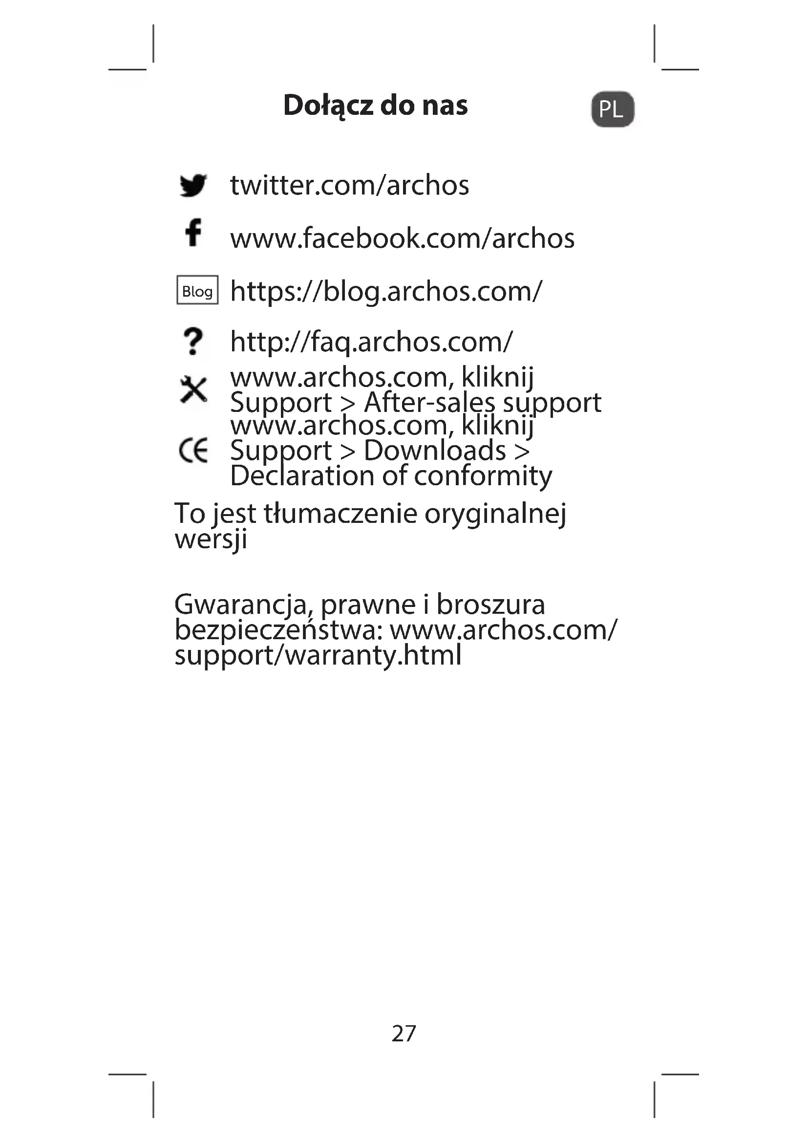 Dołącz do nas twitter.com/archos www.facebook.com/archos Blog https://blog.archos.com/ http://faq.archos.com/ www.archos.com, kliknij Support > After-sales support www.archos.com, kliknij Support > Downloads > Declaration of conformity To jest tłumaczenie oryginalnej wersji Gwarancja, prawne i broszura bezpieczeństwa: www.archos.com/ support/warranty.html28