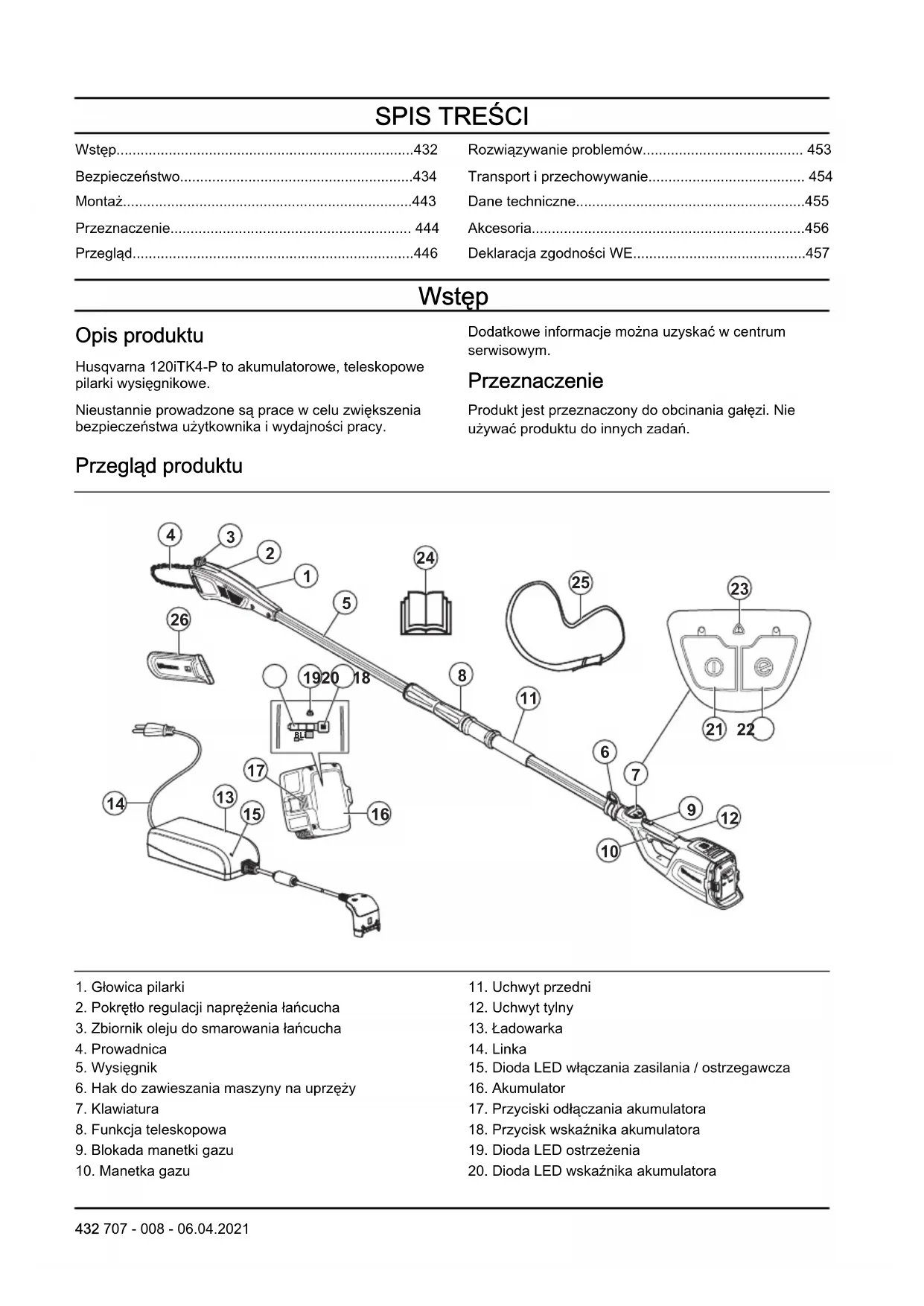 - Deklaracja zgodności WE Wstęp Opis produktu Husqvarna 120iTK4-P to akumulatorowe, teleskopowe pilarki wysięgnikowe. Nieustannie prowadzone są prace w celu zwiększenia bezpieczeństwa użytkownika i wydajności pracy. Dodatkowe informacje można uzyskać w centrum serwisowym. Przeznaczenie Produkt jest przeznaczony do obcinania gałęzi. Nie używać produktu do innych zadań. Przegląd produktu p. 457
