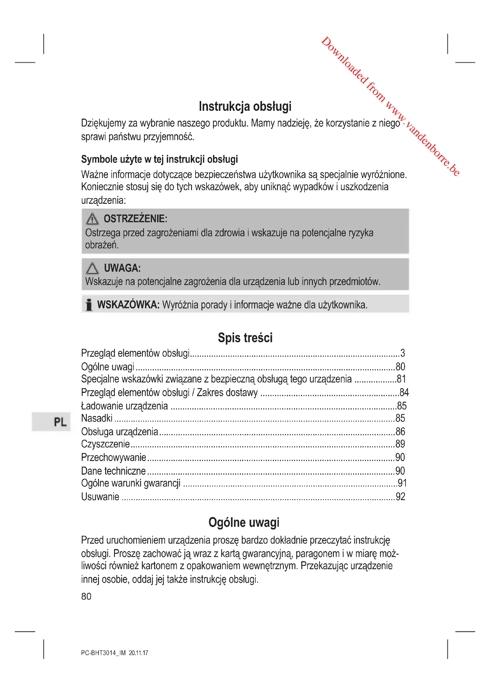 - Usuwanie Ogólne uwagi Przed uruchomieniem urządzenia proszę bardzo dokładnie przeczytać instrukcję obsługi. Proszę zachować ją wraz z kartą gwarancyjną, paragonem i w miarę moż- liwości również kartonem z opakowaniem wewnętrznym. Przekazując urządzenie innej osobie, oddaj jej także instrukcję obsługi. Downloaded from www.vandenborre.bePC-BHT3014_IM 20.11.17 p. 92
