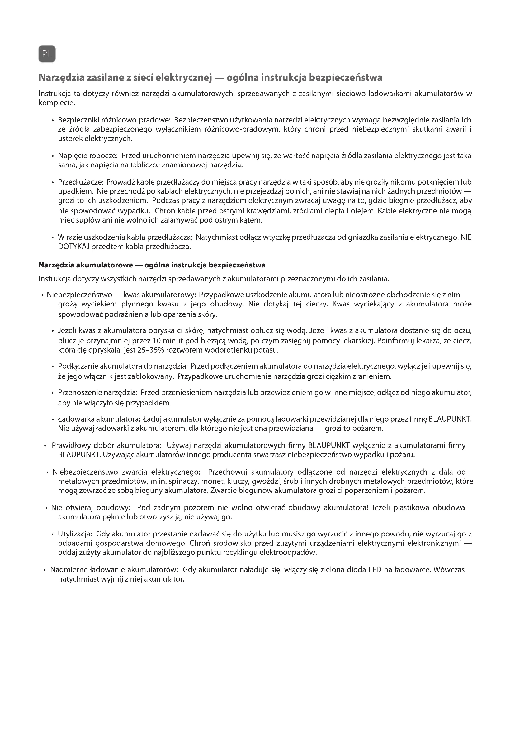 - Prawidłowy dobór akumulatora: Używaj narzędzi akumulatorowych firmy BLAUPUNKT wyłącznie z akumulatorami firmy BLAUPUNKT. Używając akumulatorów innego producenta stwarzasz niebezpieczeństwo wypadku i pożaru.