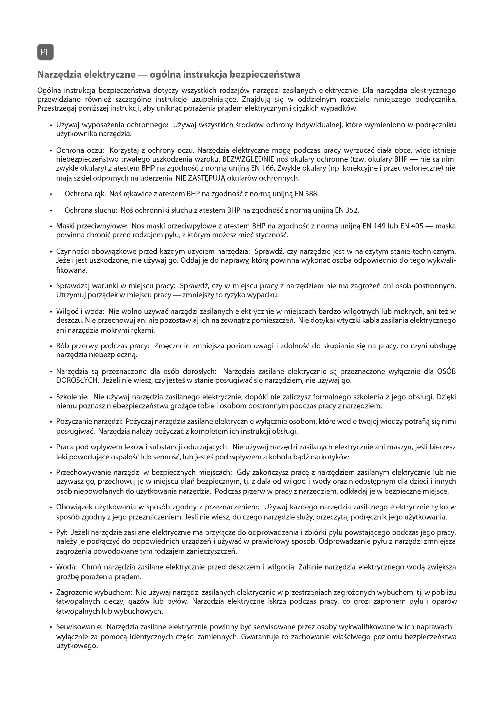 - Ochrona oczu: Korzystaj z ochrony oczu. Narzędzia elektryczne mogą podczas pracy wyrzucać ciała obce, więc istnieje niebezpieczeństwo trwałego uszkodzenia wzroku. BEZWZGLĘDNIE noś okulary ochronne (tzw. okulary BHP — nie są nimi zwykłe okulary) z atestem BHP na zgodność z normą unijną EN 166. Zwykłe okulary (np. korekcyjne i przeciwsłoneczne) nie mają szkieł odpornych na uderzenia. NIE ZASTĘPUJĄ okularów ochronnych.