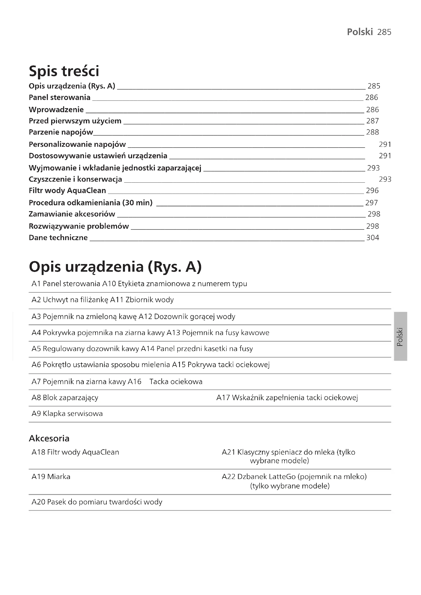 Polski PolskiPolski Spis treści Opis urządzenia (Rys. A) __________________________________________________________________ 285Panel sterowania ________________________________________________________________________ 286Wprowadzenie __________________________________________________________________________ 286Przed pierwszym użyciem ________________________________________________________________ 287Parzenie napojów________________________________________________________________________ 288 Personalizowanie napojów _______________________________________________________________ 291 Dostosowywanie ustawień urządzenia ____________________________________________________ 291 Wyjmowanie i wkładanie jednostki zaparzającej ___________________________________________ 293 Czyszczenie i konserwacja ________________________________________________________________ 293 Filtr wody AquaClean ____________________________________________________________________ 296Procedura odkamieniania (30 min) _______________________________________________________ 297Zamawianie akcesoriów __________________________________________________________________ 298Rozwiązywanie problemów ______________________________________________________________ 298Dane techniczne _________________________________________________________________________ 304 Opis urządzenia (Rys. A) A1 Panel sterowania A10 Etykieta znamionowa z numerem typuA2 Uchwyt na filiżankę A11 Zbiornik wodyA3 Pojemnik na zmieloną kawę A12 Dozownik gorącej wodyA4 Pokrywka pojemnika na ziarna kawy A13 Pojemnik na fusy kawoweA5 Regulowany dozownik kawy A14 Panel przedni kasetki na fusyA6 Pokrętło ustawiania sposobu mielenia A15 Pokrywa tacki ociekowejA7 Pojemnik na ziarna kawy A16 Tacka ociekowaA8 Blok zaparzający A17 Wskaźnik zapełnienia tacki ociekowejA9 Klapka serwisowa Akcesoria A18 Filtr wody AquaClean A21 Klasyczny spieniacz do mleka (tylkowybrane modele)A19 Miarka A22 Dzbanek LatteGo (pojemnik na mleko)(tylko wybrane modele)A20 Pasek do pomiaru twardości wody286 Polski Panel sterowania Istnieje wiele wersji tego ekspresu do kawy wyposażonych w różne panele sterowania. Każda wersja ma swój numer typu. Numer typu znajduje się na etykiecie znamionowej wewnątrz klapki serwisowej (Rys. A9). Numer typu można również znaleźć, wybierając ikonę ustawień , a następnie ikonę „Pomoc techniczna” (Support). Przegląd wszystkich przycisków i ikon przedstawiono na rysunkach C i D. Poniżej można znaleźć ich opis. Strzałki w górę i w dół służą do przewijania na wyświetlaczu. Dotykając ikony OK, można dokonać wyboru lub potwierdzić wybraną opcję. Wszystkie typy (Rys. C/D/E) Ikony napojów C1/D1/E1 C3. Ikony nawigacyjne (w górę, w dół, wstecz, OK) C6. Menu Cleaning (Czyszczenie) C2. Przycisk uruchomienia/zatrzymania przycisk C4. Wyświetlacz C7. Profile osobiste Menu D2/E2 z dodatkowymi napojami C5. Ustawienia ekspresu C8. Wyłącznik Tylko modele EP4327, EP4324, EP4321 (Rys. C) C1 Ikony napojów: Espresso, kawa (Coffee), Americano, Caffé Crema, Ristretto, Gorąca woda (hot water) i Steam Tylko modele EP4349, EP4346, EP4343, EP4341 (Rys. D) D1 Ikony napojów: Espresso, kawa (Coffee), Americano, Cappuccino, Latte Macchiato, Café au lait Tylko modele EP5447, EP5446, EP5444, EP5443, EP5441, EP5144 (Rys. E) E1 Ikony napojów: Espresso, kawa (Coffee), Americano, Cappuccino, Latte Macchiato, Café au lait Wprowadzenie Gratulujemy zakupu w pełni automatycznego ekspresu do kawy marki Philips! Aby w pełni skorzystać z oferowanej przez nas pomocy, zarejestruj produkt na stronie internetowej www.home.id. Przed skorzystaniem z urządzenia po raz pierwszy zapoznaj się dokładnie z osobną broszurą na temat bezpieczeństwa i zachowaj ją na przyszłość. Przed pierwszym użyciem spłucz gorącą wodą wszystkie zdejmowane akcesoria przeznaczone do kontaktu z wodą lub mlekiem. Aby pomóc w opanowaniu podstawowych zasad obsługi Twojego urządzenia oraz zapewnić maksymalny komfort jego użytkowania, oferujemy wsparcie na wiele sposobów. W opakowaniu urządzenia znajduje się: 1 Skrócona instrukcja obsługi zawierająca ilustrowane wskazówki dotyczące korzystania z urządzenia oraz informacje na temat jego czyszczenia i konserwacji. 2 Osobna broszura z opisem zasad bezpiecznego użytkowania ekspresu.287 Polski Polski 3 Aby uzyskać pomoc online (rozszerzona instrukcja obsługi, często zadawane pytania, filmy itd.), należy zeskanować kod QR zamieszczony na okładce tej broszury i pobrać aplikację HomeID lub odwiedzić stronę www.home.id/support. Kod QR można również znaleźć, wybierając ikonę ustawień , a następnie pomocy. To urządzenie zostało przetestowane przy użyciu kawy. Wprawdzie zostało gruntowanie oczyszczone, ale w środku mogły pozostać resztki kawy. Gwarantujemy jednak, że urządzenie jest całkowicie nowe. Ekspres automatycznie dostosowuje ilość zmielonej kawy niezbędną do uzyskania jak najlepszego w smaku napoju. Aby umożliwić urządzeniu przeprowadzenie samoregulacji, należy zaparzyć na początku 5 kaw. Przed pierwszym użyciem dzbanka LatteGo (pojemnika na mleko) lub klasycznego spieniacza do mleka należy je opłukać. Przed pierwszym użyciem