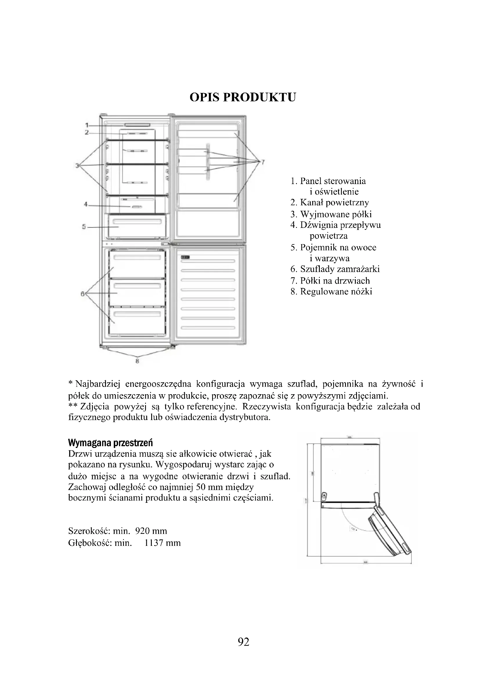 - Najbardziej energooszczędna konfiguracja wymaga szuflad, pojemnika na żywność i półek do umieszczenia w produkcie, proszę zapoznać się z powyższymi zdjęciami. ** Zdjęcia powyżej są tylko referencyjne. Rzeczywista konfiguracja będzie zależała od fizycznego produktu lub oświadczenia dystrybutora. Wymagana przestrzeń Drzwi urządzenia muszą sie ałkowicie otwierać , jak pokazano na rysunku. Wygospodaruj wystarc zając o dużo miejsc a na wygodne otwieranie drzwi i szuflad. Zachowaj odległość co najmniej 50 mm między bocznymi ścianami produktu a sąsiednimi częściami. Szerokość: min. 920 mm Głębokość: min. 1137 mm93 UŻYTKOWANIE Przycisk WŁ./WYŁ. służy do włączania/wyłączania urządzenia. Przycisk SET służy do regulacji temperatury lub do wyboru funkcji Super Cool. Ikona Super Cool pokazuje, czy funkcja jest aktywna.