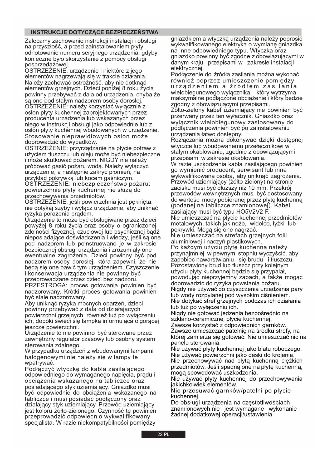 7,7 kW734 l/h560 g/h -22 PL Zalecamy zachowanie instrukcji instalacji i obsługi na przyszłość, a przed zainstalowaniem płyty odnotowanie numeru seryjnego urządzenia, gdyby konieczne było skorzystanie z pomocy obsługi posprzedażowej. OSTRZEŻENIE: urządzenie i niektóre z jego elementów nagrzewają się w trakcie działania. Należy zachować ostrożność, aby nie dotknąć elementów grzejnych. Dzieci poniżej 8 roku życia powinny przebywać z dala od urządzenia, chyba że są one pod stałym nadzorem osoby dorosłej. OSTRZEŻENIE: należy korzystać wyłącznie z osłon płyty kuchennej zaprojektowanych przez producenta urządzenia lub wskazanych przez niego w instrukcji obsługi jako odpowiednie lub z osłon płyty kuchennej wbudowanych w urządzenie. Stosowanie nieprawidłowych osłon może doprowadzić do wypadków. OSTRZEŻENIE: przyrządzanie na płycie potraw z użyciem tłuszczu lub oleju może być niebezpieczne i może skutkować pożarem. NIGDY nie należy próbować gasić pożaru wodą. Należy wyłączyć urządzenie, a następnie zakryć płomień, na przykład pokrywką lub kocem gaśniczym. OSTRZEŻENIE: niebezpieczeństwo pożaru: powierzchnie płyty kuchennej nie służą do przechowywania przedmiotów. OSTRZEŻENIE: jeśli powierzchnia jest pęknięta, nie dotykaj szyby i wyłącz urządzenie, aby uniknąć ryzyka porażenia prądem. Urządzenie to może być obsługiwane przez dzieci powyżej 8 roku życia oraz osoby o ograniczonej zdolności fizycznej, czuciowej lub psychicznej bądź nieposiadające doświadczenia i wiedzy, jeśli są one pod nadzorem lub poinstruowano je w zakresie bezpiecznej obsługi urządzenia i zrozumiały one ewentualne zagrożenia. Dzieci powinny być pod nadzorem osoby dorosłej, która zapewni, że nie będą się one bawić tym urządzeniem. Czyszczenie i konserwacja urządzenia nie powinny być przeprowadzane przez dzieci bez nadzoru. PRZESTROGA: proces gotowania powinien być nadzorowany. Krótki proces gotowania powinien być stale nadzorowany. Aby uniknąć ryzyka mocnych oparzeń, dzieci powinny przebywać z dala od działających powierzchni grzejnych, również tuż po wyłączeniu ich, dopóki świeci się lampka informująca o gorącej jeszcze powierzchni. Urządzenie to nie powinno być sterowane przez zewnętrzny regulator czasowy lub osobny system sterowania zdalnego. W przypadku urządzeń z wbudowanymi lampami halogenowymi nie należy się w lampy te wpatrywać. Podłączyć wtyczkę do kabla zasilającego odpowiedniego do wymaganego napięcia, prądu i obciążenia wskazanego na tabliczce oraz posiadającego styk uziemiający. Gniazdko musi być odpowiednie do obciążenia wskazanego na tabliczce i musi posiadać podłączony oraz działający styk uziemiający. Przewód uziemiający jest koloru żółto-zielonego. Czynność tę powinien przeprowadzić odpowiednio wykwalifikowany specjalista. W razie niekompatybilności pomiędzy