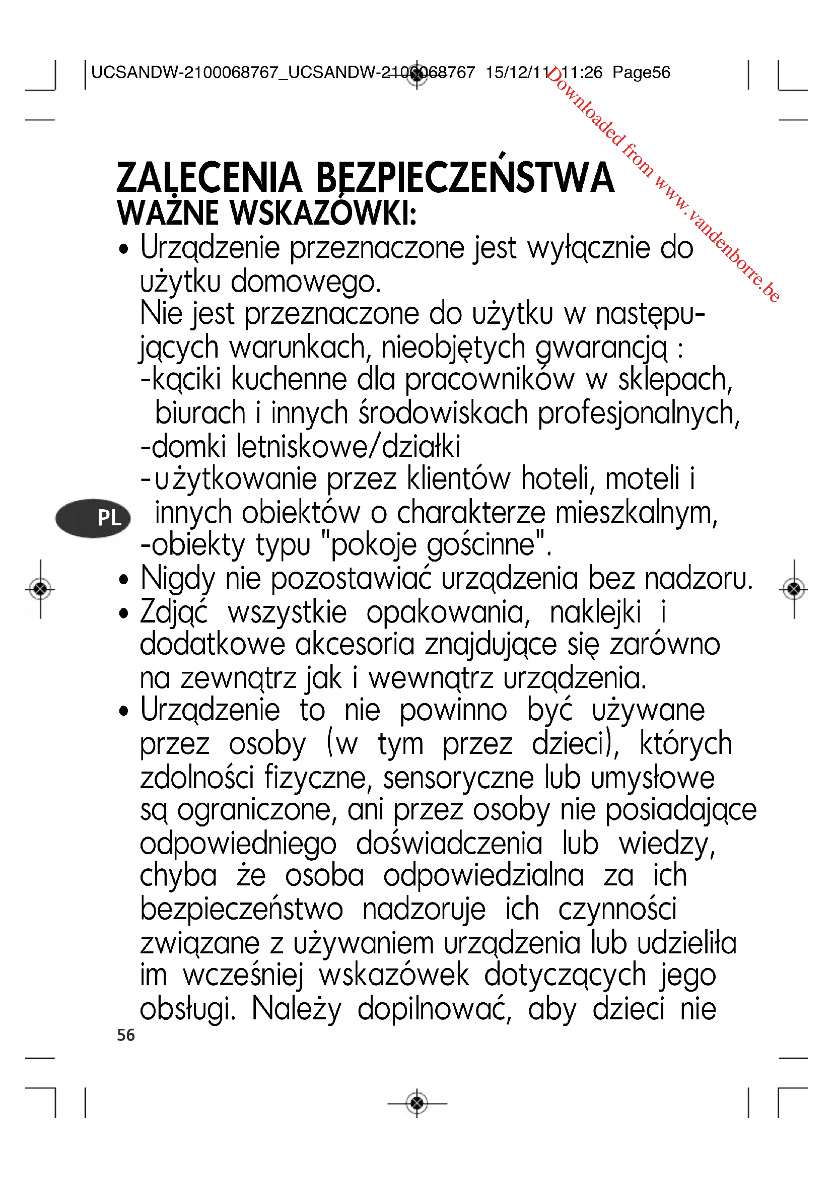 UCSANDW-2100068767_UCSANDW-2100068767 15/12/11 11:26 Page58 Downloaded from www.vandenborre.be• Należy uważnie przeczytać i przechowy- wać w podręcznym miejscu instrukcje, wspólne dla poszczególnych wersji urzą- dzenia, sprzedawanych z różnym wypo- sażeniem dodatkowym.