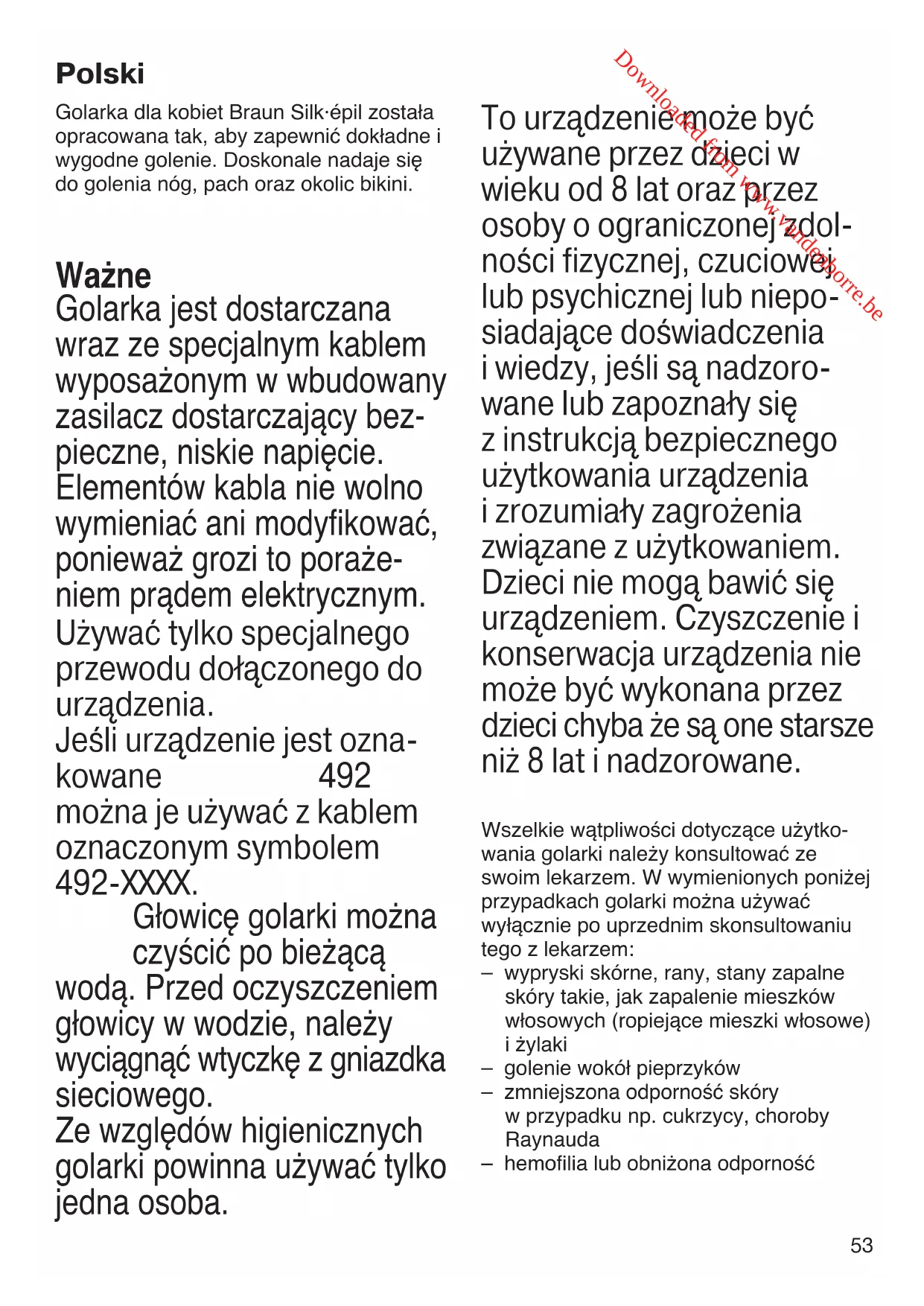 można je używać z kablem oznaczonym symbolem 492-XXXX. Głowicę golarki można czyścić po bieżącą wodą. Przed oczyszczeniem głowicy w wodzie, należy wyciągnąć wtyczkę z gniazdka sieciowego. Ze względów higienicznych golarki powinna używać tylko jedna osoba. To urządzenie może być używane przez dzieci w wieku od 8 lat oraz przez osoby o ograniczonej zdol- ności fizycznej, czuciowej lub psychicznej lub niepo- siadające doświadczenia i wiedzy, jeśli są nadzoro- wane lub zapoznały się z instrukcją bezpiecznego użytkowania urządzenia i zrozumiały zagrożenia związane z użytkowaniem. Dzieci nie mogą bawić się urządzeniem. Czyszczenie i konserwacja urządzenia nie może być wykonana przez dzieci chyba że są one starsze niż 8 lat i nadzorowane. Wszelkie wątpliwości dotyczące użytko- wania golarki należy konsultować ze swoim lekarzem. W wymienionych poniżej przypadkach golarki można używać wyłącznie po uprzednim skonsultowaniu tego z lekarzem: – wypryski skórne, rany, stany zapalne skóry takie, jak zapalenie mieszków włosowych (ropiejące mieszki włosowe) i żylaki – golenie wokół pieprzyków – zmniejszona odporność skóry w przypadku np. cukrzycy, choroby Raynauda – hemofilia lub obniżona odporność Polski 91094868_LS_5560_S6-104.indd 5391094868_LS_5560_S6-104.indd 53 27.09.16 13:3627.09.16 13:36 CSS APPROVED Effective Date 4Oct2016 GMT - Printed 04Jan2017 Page 52 of 103 Downloaded from www.vandenborre.be54 Opis 1 Nasadka goląca OptiShave 2 Głowica golarki a Folia goląca b Pasek SoftStrip c Poduszka amortyzująca EasyGlide d Trymer do długich włosów e Przyciski blokady głowicy f Przełącznik golenie/tryme «