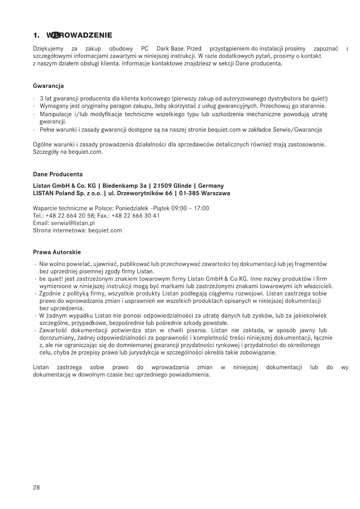 Dziękujemy za zakup obudowy PC DarkBase.Przed przystąpieniemdoinstalacjiprosimy zapoznać sięze szczegółowymiinformacjamizawartymiwniniejszejinstrukcji.Wraziedodatkowychpytań,prosimyokontakt znaszymdziałemobsługiklienta.InformacjekontaktoweznajdzieszwsekcjiDaneproducenta. Gwarancja ∙ 3latgwarancjiproducentadlaklientakońcowego(pierwszyzakupodautoryzowanegodystrybutorabequiet!) ∙ Wymaganyjestoryginalnyparagonzakupu,żebyskorzystaćzusługgwarancyjnych.Przechowujgostarannie. ∙ Manipulacje i/lub modykacje technicznewszelkiegotypulub uszkodzenia mechaniczne powodują utratę gwarancji. ∙ Pełnewarunkiizasadygwarancjidostępnesąnanaszejstroniebequiet.comwzakładceSerwis/Gwarancja Ogólnewarunkiizasadyprowadzeniadziałalnościdlasprzedawcówdetalicznychrównieżmajązastosowanie. Szczegółynabequiet.com. Dane Producenta Listan GmbH & Co. KG | Biedenkamp 3a | 21509 Glinde | Germany LISTAN Poland Sp. z o.o. | ul. Drzeworytników 66 | 01-385 Warszawa WsparcietechnicznewPolsce:Poniedziałek–Piątek09:00–17:00 Tel.: +48 22 664 20 58; Fax.: +48 22 666 30 41 Email: serwis@listan.pl Strona internetowa: bequiet.com Prawa Autorskie ∙ Niewolnopowielać,ujawniać,publikowaćlubprzechowywaćzawartościtejdokumentacjilubjejfragmentów bezuprzedniejpisemnejzgodyrmyListan. ∙ bequiet!jestzastrzeżonymznakiemtowarowymrmyListanGmbH&CoKG.Innenazwyproduktówirm wymienionewniniejszejinstrukcjimogąbyćmarkamilubzastrzeżonymiznakamitowarowymiichwłaścicieli. ∙ Zgodniezpolitykąrmy,wszystkieproduktyListanpodlegająciągłemurozwojowi.Listanzastrzegasobie prawodowprowadzaniazmianiusprawnieńwewszelkichproduktachopisanychwniniejszejdokumentacji bez uprzedzenia. ∙ WżadnymwypadkuListannieponosiodpowiedzialnościzautratędanychlubzysków,lubzajakiekolwiek szczególne,przypadkowe,bezpośrednielubpośrednieszkodypowstałe. ∙ Zawartość dokumentacji potwierdza stan w chwili pisania. Listan nie zakłada, w sposób jawny lub dorozumiany,żadnejodpowiedzialnościzapoprawnośćikompletnośćtreścininiejszejdokumentacji,łącznie z,alenieograniczającsiędodomniemanejgwarancjiprzydatnościrynkowejiprzydatnościdookreślonego celu,chybażeprzepisyprawalubjurysdykcjawszczególnościokreślatakiezobowiązanie. Listan zastrzega sobie prawo do wprowadzania zmian w niniejszej dokumentacji lub do wycofania się z dokumentacjąwdowolnymczasiebezuprzedniegopowiadomienia.28 29