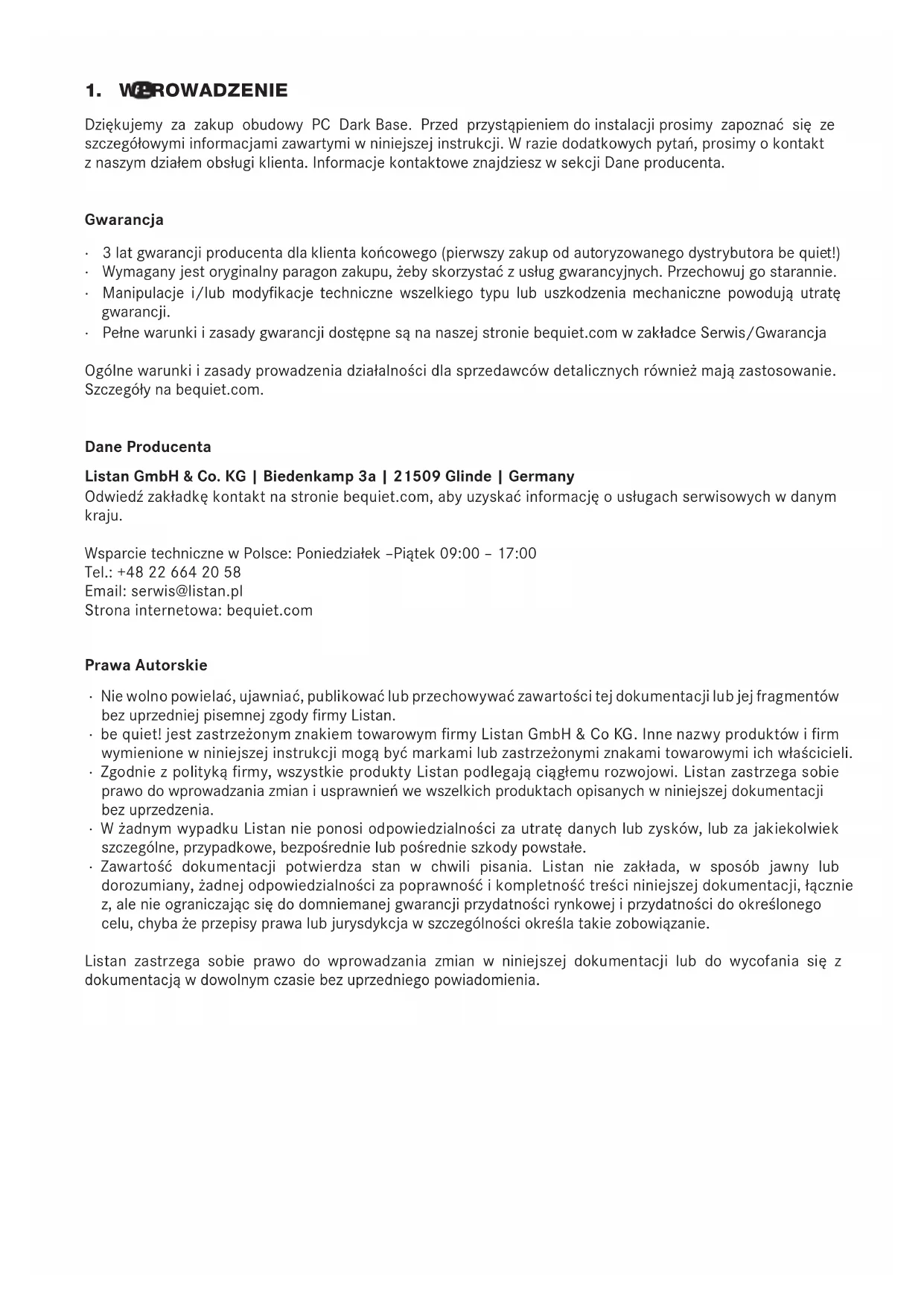 Dziękujemy za zakup obudowy PC Dark Base. Przed przystąpieniem do instalacji prosimy zapoznać się ze szczegółowymi informacjami zawartymi w niniejszej instrukcji. W razie dodatkowych pytań, prosimy o kontakt z naszym działem obsługi klienta. Informacje kontaktowe znajdziesz w sekcji Dane producenta. Gwarancja ∙ 3 lat gwarancji producenta dla klienta końcowego (pierwszy zakup od autoryzowanego dystrybutora be quiet!) ∙ Wymagany jest oryginalny paragon zakupu, żeby skorzystać z usług gwarancyjnych. Przechowuj go starannie. ∙ Manipulacje i/lub modykacje techniczne wszelkiego typu lub uszkodzenia mechaniczne powodują utratę gwarancji. ∙ Pełne warunki i zasady gwarancji dostępne są na naszej stronie bequiet.com w zakładce Serwis/Gwarancja Ogólne warunki i zasady prowadzenia działalności dla sprzedawców detalicznych również mają zastosowanie. Szczegóły na bequiet.com. Dane Producenta Listan GmbH & Co. KG | Biedenkamp 3a | 21509 Glinde | Germany Odwiedź zakładkę kontakt na stronie bequiet.com, aby uzyskać informację o usługach serwisowych w danym kraju. Wsparcie techniczne w Polsce: Poniedziałek –Piątek 09:00 – 17:00 Tel.: +48 22 664 20 58 Email: serwis@listan.pl Strona internetowa: bequiet.com Prawa Autorskie ∙ Nie wolno powielać, ujawniać, publikować lub przechowywać zawartości tej dokumentacji lub jej fragmentów bez uprzedniej pisemnej zgody rmy Listan. ∙ be quiet! jest zastrzeżonym znakiem towarowym rmy Listan GmbH & Co KG. Inne nazwy produktów i rm wymienione w niniejszej instrukcji mogą być markami lub zastrzeżonymi znakami towarowymi ich właścicieli. ∙ Zgodnie z polityką rmy, wszystkie produkty Listan podlegają ciągłemu rozwojowi. Listan zastrzega sobie prawo do wprowadzania zmian i usprawnień we wszelkich produktach opisanych w niniejszej dokumentacji bez uprzedzenia. ∙ W żadnym wypadku Listan nie ponosi odpowiedzialności za utratę danych lub zysków, lub za jakiekolwiek szczególne, przypadkowe, bezpośrednie lub pośrednie szkody powstałe. ∙ Zawartość dokumentacji potwierdza stan w chwili pisania. Listan nie zakłada, w sposób jawny lub dorozumiany, żadnej odpowiedzialności za poprawność i kompletność treści niniejszej dokumentacji, łącznie z, ale nie ograniczając się do domniemanej gwarancji przydatności rynkowej i przydatności do określonego celu, chyba że przepisy prawa lub jurysdykcja w szczególności określa takie zobowiązanie. Listan zastrzega sobie prawo do wprowadzania zmian w niniejszej dokumentacji lub do wycofania się z dokumentacją w dowolnym czasie bez uprzedniego powiadomienia.20 21