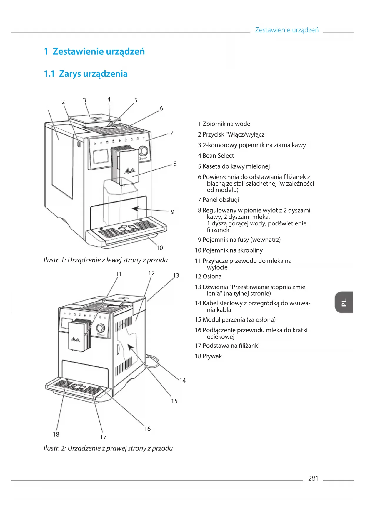 Ilustr. 2: Urządzenie z prawej strony z przodu 1 Zbiornik na wodę 2 Przycisk "Włącz/wyłącz" 3 2-komorowy pojemnik na ziarna kawy 4 Bean Select 5 Kaseta do kawy mielonej 6 Powierzchnia do odstawiania liżanek z blachą ze stali szlachetnej (w zależności od modelu) 7 Panel obsługi 8 Regulowany w pionie wylot z 2 dyszami kawy, 2 dyszami mleka, 1dyszą gorącej wody, podświetlenie liżanek 9 Pojemnik na fusy (wewnątrz) 10 Pojemnik na skropliny 11 Przyłącze przewodu do mleka na wylocie 12 Osłona 13 Dźwignia "Przestawianie stopnia zmie- lenia" (na tylnej stronie) 14 Kabel sieciowy z przegródką do wsuwa- nia kabla 15 Moduł parzenia (za osłoną) 16 Podłączenie przewodu mleka do kratki ociekowej 17 Podstawa na liżanki 18 PływakZestawienie urządzeń