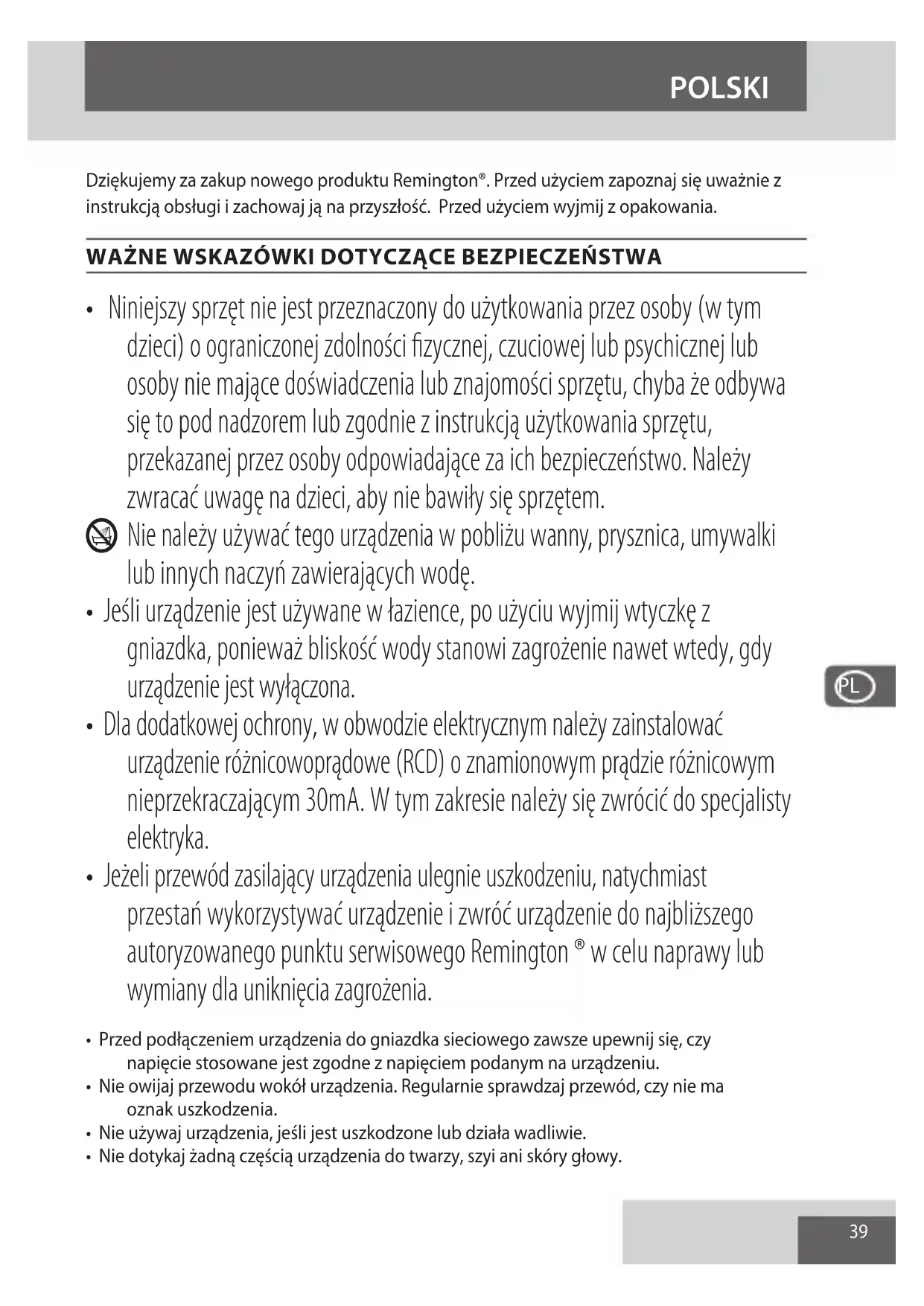 - Jeżeli przewód zasilający urządzenia ulegnie uszkodzeniu, natychmiast przestań wykorzystywać urządzenie i zwróć urządzenie do najbliższego autoryzowanego punktu serwisowego Remington ® w celu naprawy lub wymiany dla uniknięcia zagrożenia.