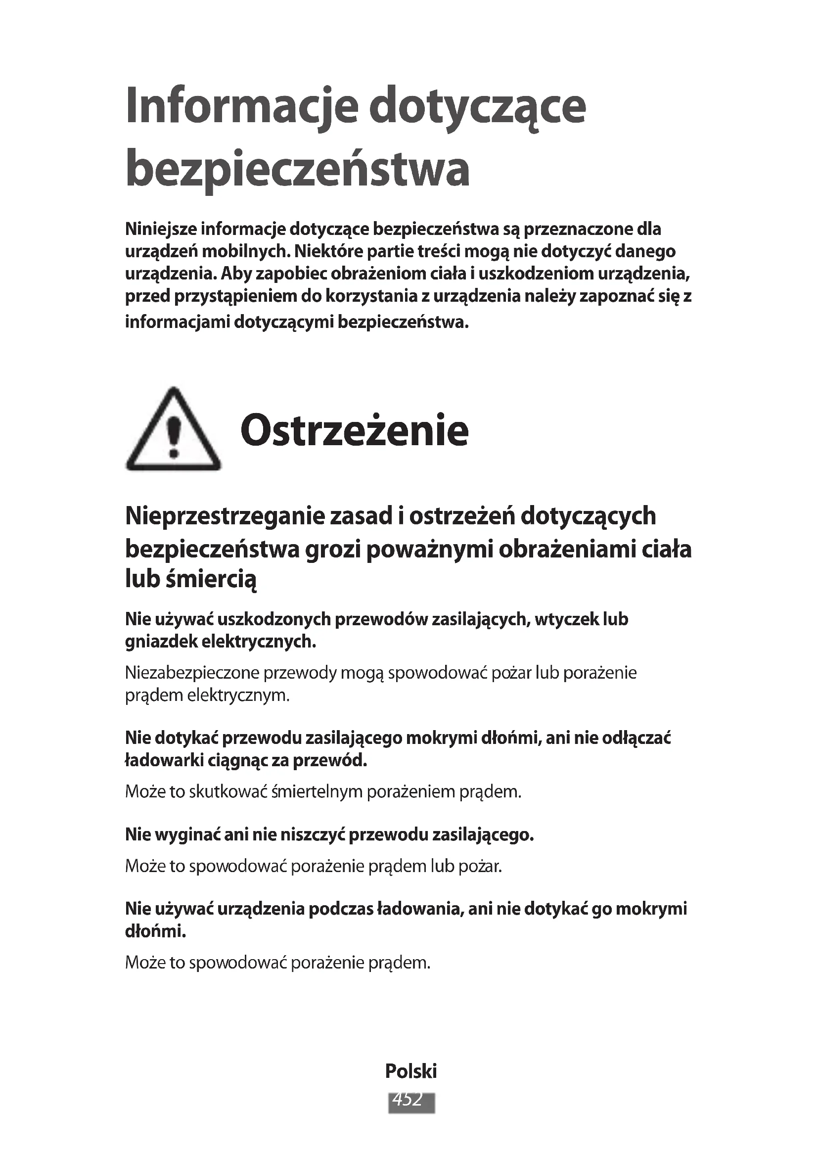 Informacje dotyczące bezpieczeństwa Niniejsze informacje dotyczące bezpieczeństwa są przeznaczone dla urządzeń mobilnych. Niektóre partie treści mogą nie dotyczyć danego urządzenia. Aby zapobiec obrażeniom ciała i uszkodzeniom urządzenia, przed przystąpieniem do korzystania z urządzenia należy zapoznać się z informacjami dotyczącymi bezpieczeństwa. Ostrzeżenie Nieprzestrzeganie zasad i ostrzeżeń dotyczących bezpieczeństwa grozi poważnymi obrażeniami ciała lub śmiercią Nie używać uszkodzonych przewodów zasilających, wtyczek lub gniazdek elektrycznych. Niezabezpieczone przewody mogą spowodować pożar lub porażenie prądem elektrycznym.Nie dotykać przewodu zasilającego mokrymi dłońmi, ani nie odłączać ładowarki ciągnąc za przewód. Może to skutkować śmiertelnym porażeniem prądem. Nie wyginać ani nie niszczyć przewodu zasilającego. Może to spowodować porażenie prądem lub pożar. Nie używać urządzenia podczas ładowania, ani nie dotykać go mokrymi dłońmi. Może to spowodować porażenie prądem.Polski