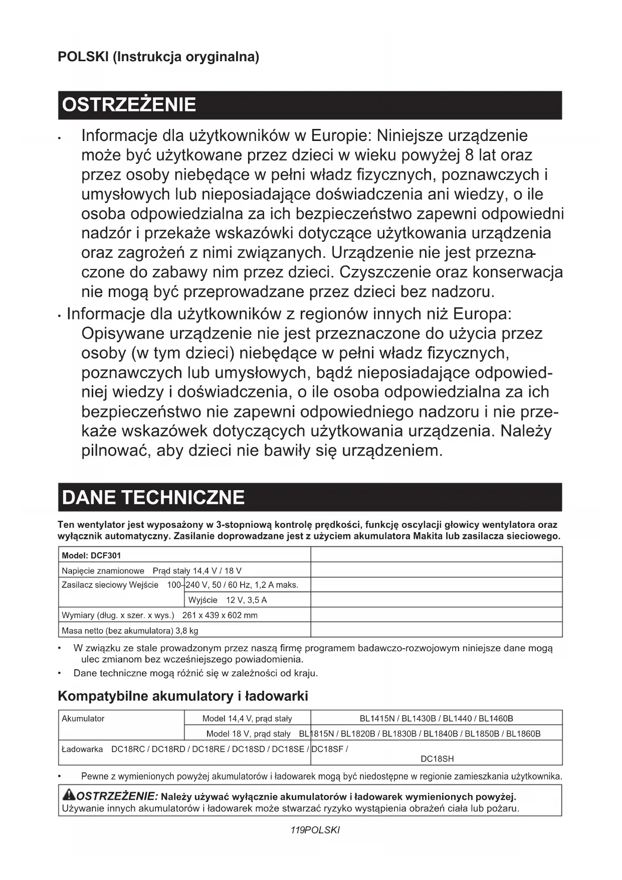 - InformacjedlaużytkownikówzregionówinnychniżEuropa: Opisywaneurządzenieniejestprzeznaczonedoużyciaprzez osoby(wtymdzieci)niebędącewpełniwładzzycznych, poznawczychlubumysłowych,bądźnieposiadająceodpowied- niejwiedzyidoświadczenia,oileosobaodpowiedzialnazaich bezpieczeństwoniezapewniodpowiedniegonadzoruinieprze- każewskazówekdotyczącychużytkowaniaurządzenia.Należy pilnować,abydzieciniebawiłysięurządzeniem. DANE TECHNICZNE Ten wentylator jest wyposażony w 3-stopniową kontrolę prędkości, funkcję oscylacji głowicy wentylatora oraz wyłącznik automatyczny. Zasilanie doprowadzane jest z użyciem akumulatora Makita lub zasilacza sieciowego. Model: DCF301Napięcieznamionowe Prądstały14,4V/18VZasilacz sieciowy Wejście 100–240 V, 50 / 60 Hz, 1,2 A maks.Wyjście 12 V, 3,5 AWymiary(dług.xszer.xwys.) 261 x 439 x 602 mmMasa netto (bez akumulatora) 3,8 kg