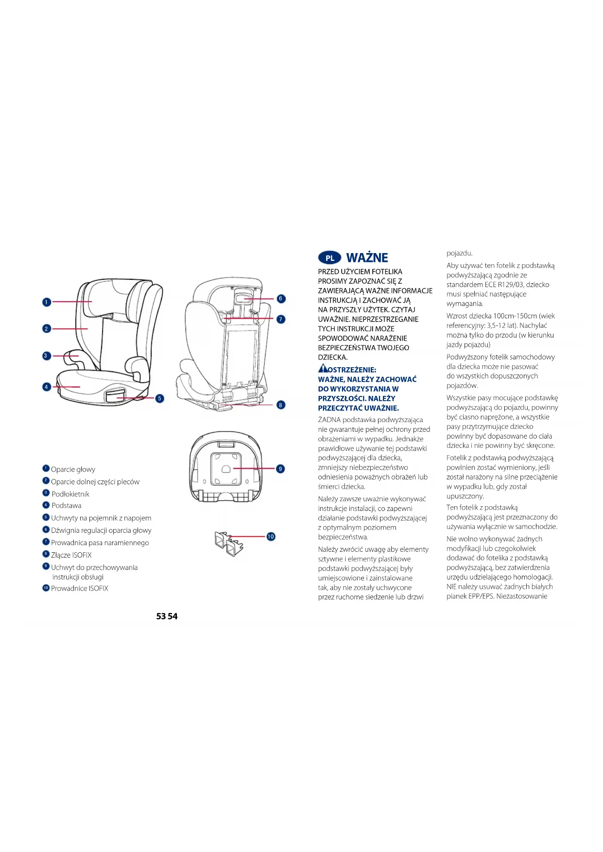 PRZECZYTAĆ UWAŻNIE. ŻADNA podstawka podwyższająca nie gwarantuje pełnej ochrony przed obrażeniami w wypadku. Jednakże prawidłowe używanie tej podstawki podwyższającej dla dziecka, zmniejszy niebezpieczeństwo odniesienia poważnych obrażeń lub śmierci dziecka. Należy zawsze uważnie wykonywać instrukcje instalacji, co zapewni działanie podstawki podwyższającej z optymalnym poziomem bezpieczeństwa. Należy zwrócić uwagę aby elementy sztywne i elementy plastikowe podstawki podwyższającej były umiejscowione i zainstalowane tak, aby nie zostały uchwycone przez ruchome siedzenie lub drzwi pojazdu. Aby używać ten fotelik z podstawką podwyższającą zgodnie ze standardem ECE R129/03, dziecko musi spełniać następujące wymagania. Wzrost dziecka 100cm-150cm (wiek referencyjny: 3,5-12 lat). Nachylać można tylko do przodu (w kierunku jazdy pojazdu) Podwyższony fotelik samochodowy dla dziecka może nie pasować do wszystkich dopuszczonych pojazdów. Wszystkie pasy mocujące podstawkę podwyższającą do pojazdu, powinny być ciasno naprężone, a wszystkie pasy przytrzymujące dziecko powinny być dopasowane do ciała dziecka i nie powinny być skręcone. Fotelik z podstawką podwyższającą powinien zostać wymieniony, jeśli został narażony na silne przeciążenie w wypadku lub, gdy został upuszczony. Ten fotelik z podstawką podwyższającą jest przeznaczony do używania wyłącznie w samochodzie. Nie wolno wykonywać żadnych modykacji lub czegokolwiek dodawać do fotelika z podstawką podwyższającą, bez zatwierdzenia urzędu udzielającego homologacji. NIE należy usuwać żadnych białych pianek EPP/EPS. Niezastosowanie55 56 się do tego polecenia, może spowodować poważne problemy dotyczące bezpieczeństwa. NIE należy używać fotelika, jeśli jego powierzchnie zostały zbyt silnie nagrzane promieniami słońca. Nigdy nie należy pozostawiać dziecka bez opieki w foteliku z podstawką podwyższającą lub w pojeździe, nawet na kilka minut. Wszelki bagaż lub inne przedmioty, które mogą spowodować obrażenia ciała w razie kolizji powinny być prawidłowo zabezpieczone. Nie należy używać tej podstawki podwyższającej bez miękkich wkładek. Miękkich wkładek nie należy zastępować innymi niż zalecane przez producenta, ponieważ stanowią one integralny element skuteczności działania podstawki podwyższającej. Zawsze należy zapiąć dziecko w podstawce podwyższającej, nawet na krótkich trasach, ponieważ wówczas zdarza się większość wypadków. NIE należy pozostawiać w pojeździe tej podstawki podwyższającej lub innych obiektów niezamocowanych pasami lub niezabezpieczonych. Fotelik z podstawką podwyższającą należy wyjąć z samochodu, jeśli nie jest często używany i umieścić go w suchym, zabezpieczonym przed słońcem miejscu. Zaleca się, aby nie wykorzystywać używanego fotelika z podstawką podwyższającą o nieznanej historii. Może on mieć niewidoczne uszkodzenia konstrukcji lub defekty spowodowane nieprawidłowym używaniem/przechowywaniem. NIE należy używać żadnych innych punktów styku przenoszenia obciążenia, niż opisane w instrukcjach i oznaczone na podstawce podwyższającej. NIE należy instalować tej podstawki podwyższającej w następujących warunkach: