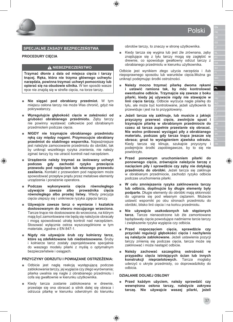 NL PT DA SV FI NO RU PL CS HU RO LV LT ET HR SL SK EL TR Polski wewnętrzna osłona tarczy nie może być swobodnie uruchomiona i jeżeli nie opada natychmiast na tarczę. Nie nalezy mocować czy przyczepiać dolnej osłony tarczy w pozycji otwartej. Gdyby pilarka przypadkowo spadła, wewnętrzna osłona tarczy mogłaby się zgiąć. Podnieście do góry dolną osłonę tarczy przy pomocy dźwigni i upewnijcie się, że można ją z łatwością manipulować i że nie dotyka ona ani tarczy ani żadnej innej części, bez względu na wybrany kąt i głębokość cięcia. ■