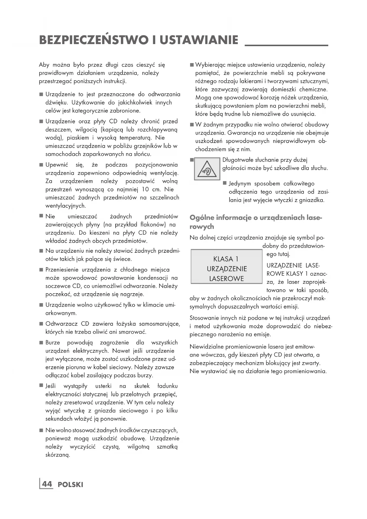 ROWE KLASY 1 oznac- za, że laser zaprojek- towano w taki sposób, aby w żadnych okolicznościach nie przekroczył mak- symalnych dopuszczalnych wartości emisji. Stosowanie innych niż podane w tej instrukcji urządzeń i metod użytkowania może doprowadzić do niebez- piecznego narażenia na emisje. Niewidzialne promieniowanie lasera jest emitow- ane wówczas, gdy kieszeń płyty CD jest otwarta, a zabezpieczający mechanizm blokujący jest zwarty. Nie wystawiać się na działanie tego promieniowania. Aby można było przez długi czas cieszyć się prawidłowym działaniem urządzenia, należy przestrzegać poniższych instrukcji.