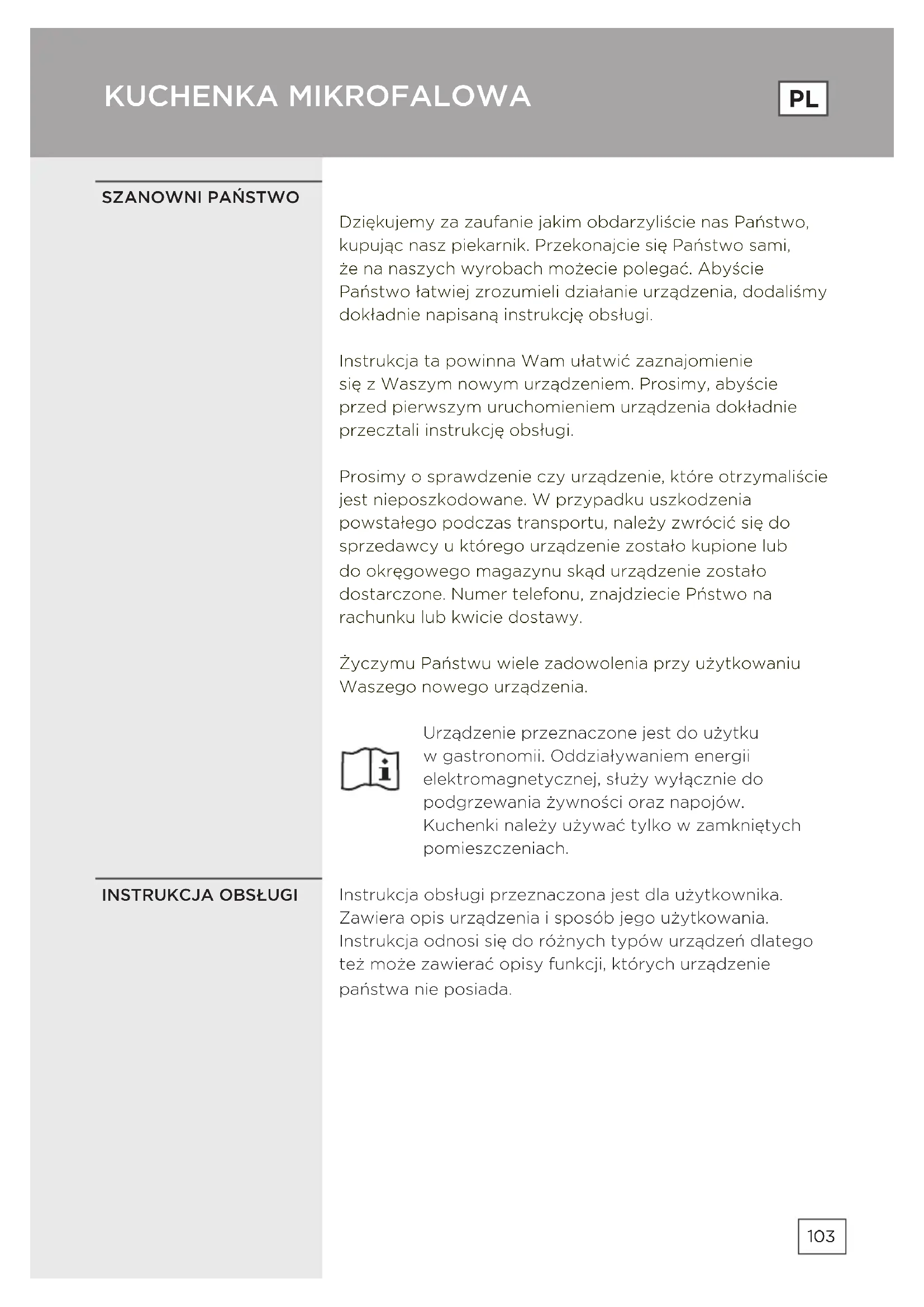 Dziękujemy za zaufanie jakim obdarzyliście nas Państwo, kupując nasz piekarnik. Przekonajcie się Państwo sami, że na naszych wyrobach możecie polegać. Abyście Państwo łatwiej zrozumieli działanie urządzenia, dodaliśmy dokładnie napisaną instrukcję obsługi. Instrukcja ta powinna Wam ułatwić zaznajomienie się z Waszym nowym urządzeniem. Prosimy, abyście przed pierwszym uruchomieniem urządzenia dokładnie przecztali instrukcję obsługi. Prosimy o sprawdzenie czy urządzenie, które otrzymaliście jest nieposzkodowane. W przypadku uszkodzenia powstałego podczas transportu, należy zwrócić się do sprzedawcy u którego urządzenie zostało kupione lub do okręgowego magazynu skąd urządzenie zostało dostarczone. Numer telefonu, znajdziecie Pństwo na rachunku lub kwicie dostawy. Życzymu Państwu wiele zadowolenia przy użytkowaniu Waszego nowego urządzenia. Urządzenie przeznaczone jest do użytku w gastronomii. Oddziaływaniem energii elektromagnetycznej, służy wyłącznie do podgrzewania żywności oraz napojów. Kuchenki należy używać tylko w zamkniętych pomieszczeniach. Instrukcja obsługi przeznaczona jest dla użytkownika. Zawiera opis urządzenia i sposób jego użytkowania. Instrukcja odnosi się do różnych typów urządzeń dlatego też może zawierać opisy funkcji, których urządzenie państwa nie posiada.