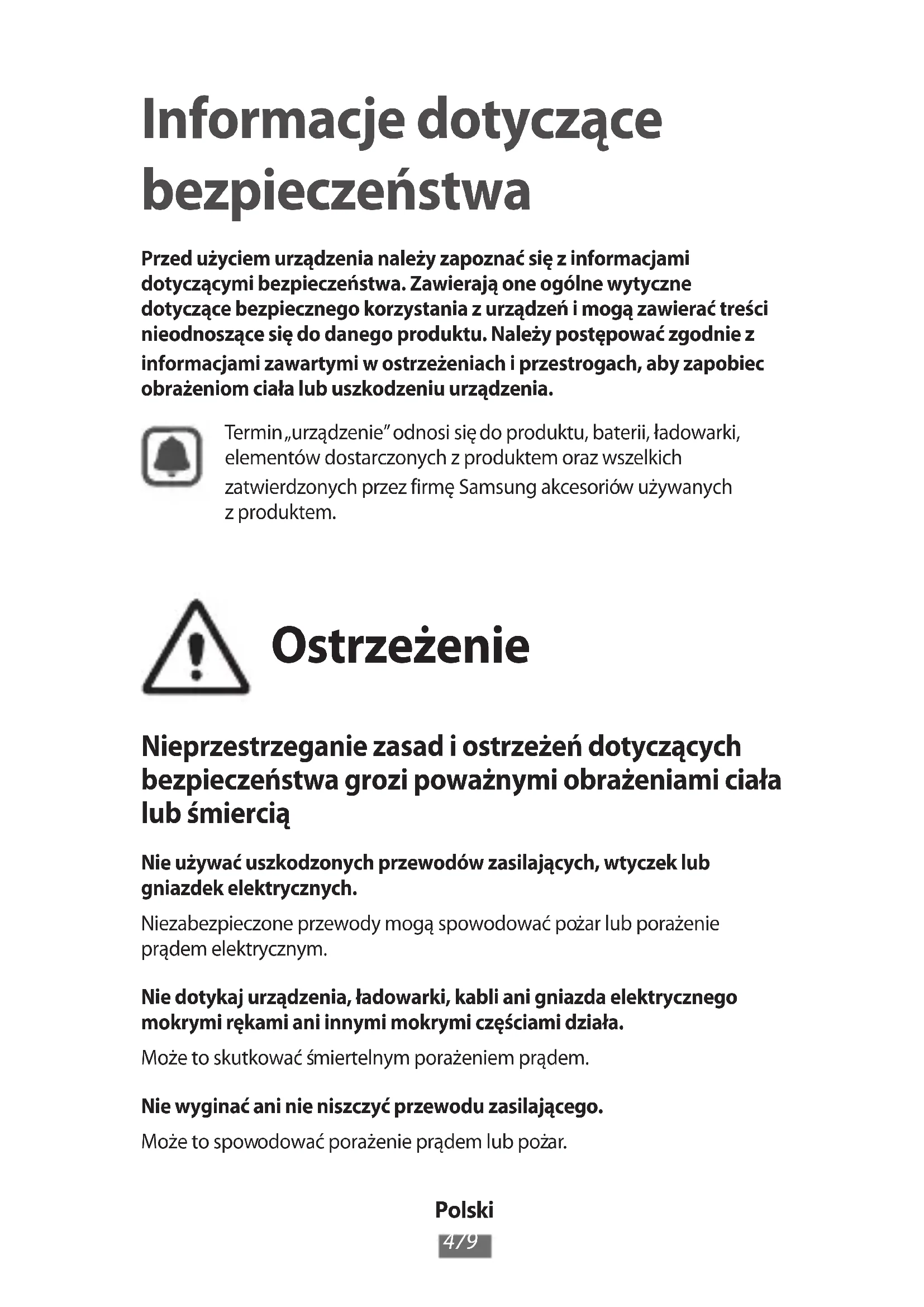 Informacje dotyczące bezpieczeństwa Przed użyciem urządzenia należy zapoznać się z informacjami dotyczącymi bezpieczeństwa. Zawierają one ogólne wytyczne dotyczące bezpiecznego korzystania z urządzeń i mogą zawierać treści nieodnoszące się do danego produktu. Należy postępować zgodnie z informacjami zawartymi w ostrzeżeniach i przestrogach, aby zapobiec obrażeniom ciała lub uszkodzeniu urządzenia. Termin „urządzenie” odnosi się do produktu, baterii, ładowarki, elementów dostarczonych z produktem oraz wszelkich zatwierdzonych przez firmę Samsung akcesoriów używanych z produktem. Ostrzeżenie Nieprzestrzeganie zasad i ostrzeżeń dotyczących bezpieczeństwa grozi poważnymi obrażeniami ciała lub śmiercią Nie używać uszkodzonych przewodów zasilających, wtyczek lub gniazdek elektrycznych. Niezabezpieczone przewody mogą spowodować pożar lub porażenie prądem elektrycznym.Nie dotykaj urządzenia, ładowarki, kabli ani gniazda elektrycznego mokrymi rękami ani innymi mokrymi częściami działa. Może to skutkować śmiertelnym porażeniem prądem. Nie wyginać ani nie niszczyć przewodu zasilającego. Może to spowodować porażenie prądem lub pożar.Polski