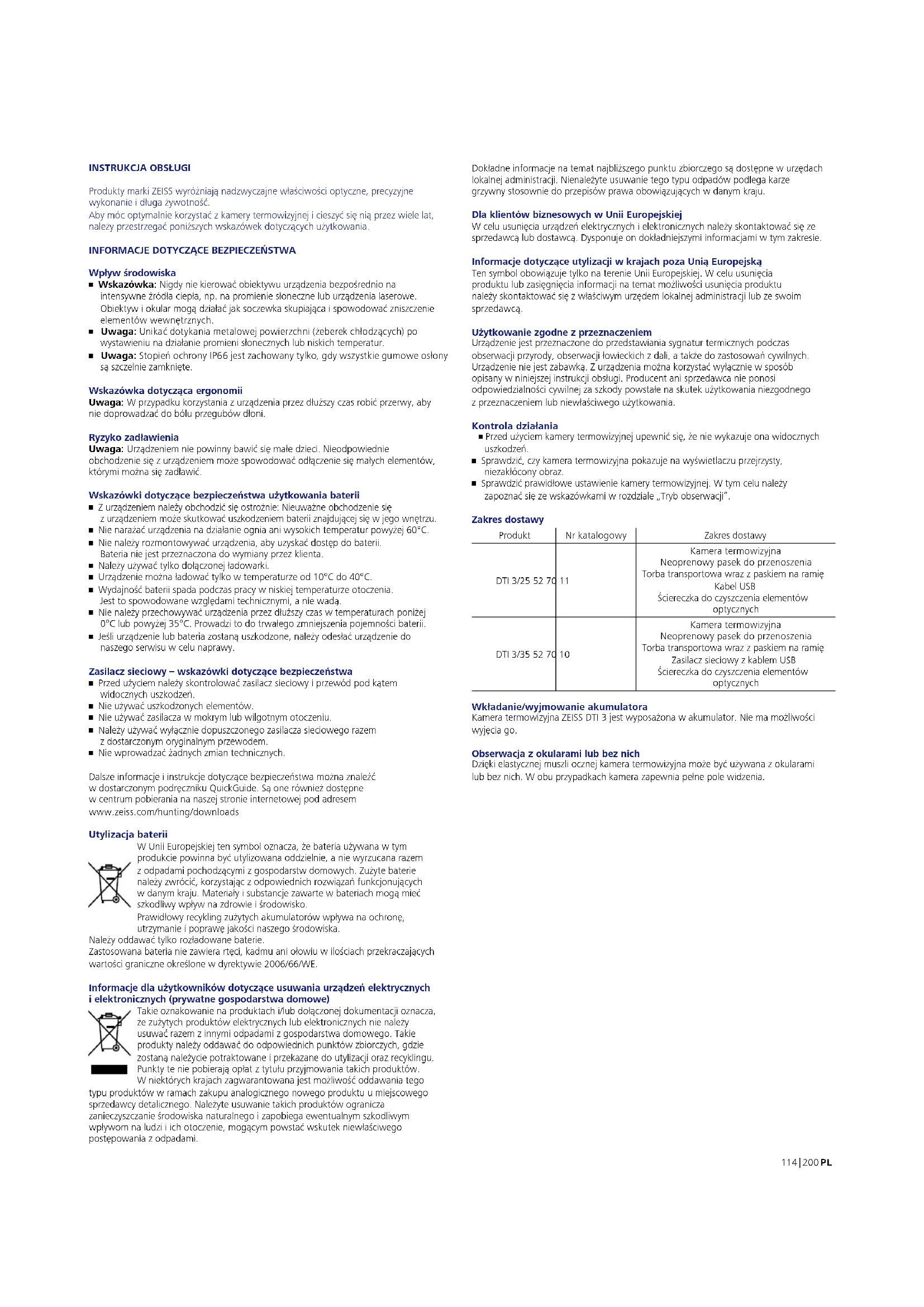 - Nie wprowadzać żadnych zmian technicznych. Dalsze informacje iinstrukcje dotyczące bezpieczeństwa można znaleźć wdostarczonym podręczniku QuickGuide. Są one również dostępne w centrum pobierania na naszej stronie internetowej pod adresem www.zeiss.com/hunting/downloads Utylizacja baterii W Unii Europejskiej ten symbol oznacza, że bateria używana w tym produkcie powinna być utylizowana oddzielnie, anie wyrzucana razem zodpadami pochodzącymi z gospodarstw domowych. Zużyte baterie należy zwrócić, korzystając z odpowiednich rozwiązań funkcjonujących wdanym kraju. Materiały isubstancje zawarte w bateriach mogą mieć szkodliwy wpływ na zdrowie iśrodowisko. Prawidłowy recykling zużytych akumulatorów wpływa na ochronę, utrzymanie ipoprawę jakości naszego środowiska. Należy oddawać tylko rozładowane baterie. Zastosowana bateria nie zawiera rtęci, kadmu ani ołowiu w ilościach przekraczających wartości graniczne określone w dyrektywie 2006/66/WE. Informacje dla użytkowników dotyczące usuwania urządzeń elektrycznych ielektronicznych (prywatne gospodarstwa domowe) Takie oznakowanie na produktach i/lub dołączonej dokumentacji oznacza, że zużytych produktów elektrycznych lub elektronicznych nie należy usuwać razem z innymi odpadami z gospodarstwa domowego. Takie produkty należy oddawać do odpowiednich punktów zbiorczych, gdzie zostaną należycie potraktowane iprzekazane do utylizacji oraz recyklingu. Punkty te nie pobierają opłat z tytułu przyjmowania takich produktów. Wniektórych krajach zagwarantowana jest możliwość oddawania tego typu produktów w ramach zakupu analogicznego nowego produktu u miejscowego sprzedawcy detalicznego. Należyte usuwanie takich produktów ogranicza zanieczyszczanie środowiska naturalnego izapobiega ewentualnym szkodliwym wpływom na ludzi iich otoczenie, mogącym powstać wskutek niewłaściwego postępowania z odpadami. Dokładne informacje na temat najbliższego punktu zbiorczego są dostępne wurzędach lokalnej administracji. Nienależyte usuwanie tego typu odpadów podlega karze grzywny stosownie do przepisów prawa obowiązujących w danym kraju. Dla klientów biznesowych w Unii Europejskiej W celu usunięcia urządzeń elektrycznych ielektronicznych należy skontaktować sięze sprzedawcą lub dostawcą. Dysponuje on dokładniejszymi informacjami w tym zakresie. Informacje dotyczące utylizacji w krajach poza Unią Europejską Ten symbol obowiązuje tylko na terenie Unii Europejskiej. W celu usunięcia produktu lub zasięgnięcia informacji na temat możliwości usunięcia produktu należy skontaktować się z właściwym urzędem lokalnej administracji lub ze swoim sprzedawcą. Użytkowanie zgodne z przeznaczeniem Urządzenie jest przeznaczone do przedstawiania sygnatur termicznych podczas obserwacji przyrody, obserwacji łowieckich z dali, atakże do zastosowań cywilnych. Urządzenie nie jest zabawką. Z urządzenia można korzystać wyłącznie w sposób opisany w niniejszej instrukcji obsługi. Producent ani sprzedawca nie ponosi odpowiedzialności cywilnej za szkody powstałe na skutek użytkowania niezgodnego zprzeznaczeniem lub niewłaściwego użytkowania. Kontrola działania