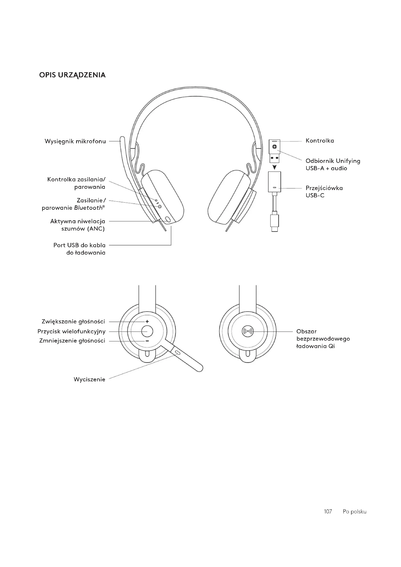 Port USB do kabla doładowania Przejściówka USB-C Kontrolka Odbiornik Unifying USB-A + audio Zwiększanie głośności Zmniejszenie głośności Wyciszenie Przycisk wielofunkcyjny Obszar bezprzewodowego ładowania Qi 107 Po polskuUSB-A USB-C ADAPTER USB-A | USB-C Logi Zone