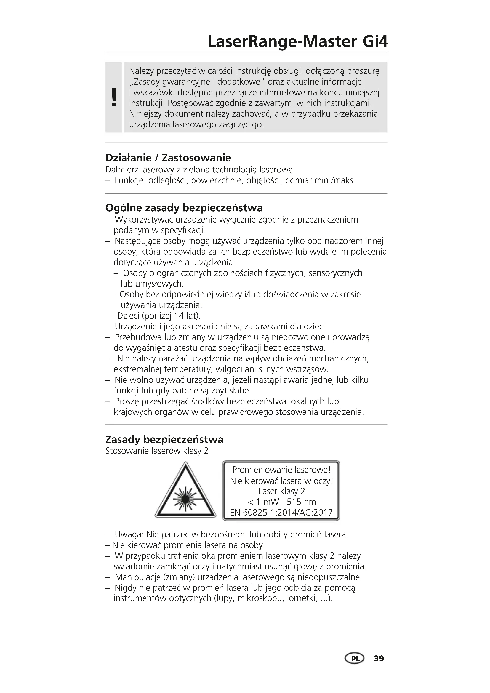 Działanie / Zastosowanie Należy przeczytać wcałości instrukcję obsługi, dołączoną broszurę „Zasady gwarancyjne idodatkowe” oraz aktualne informacje iwskazówki dostępne przez łącze internetowe na końcu niniejszej instrukcji. Postępować zgodnie z zawartymi w nich instrukcjami. Niniejszy dokument należy zachować, a w przypadku przekazania urządzenia laserowego załączyć go.