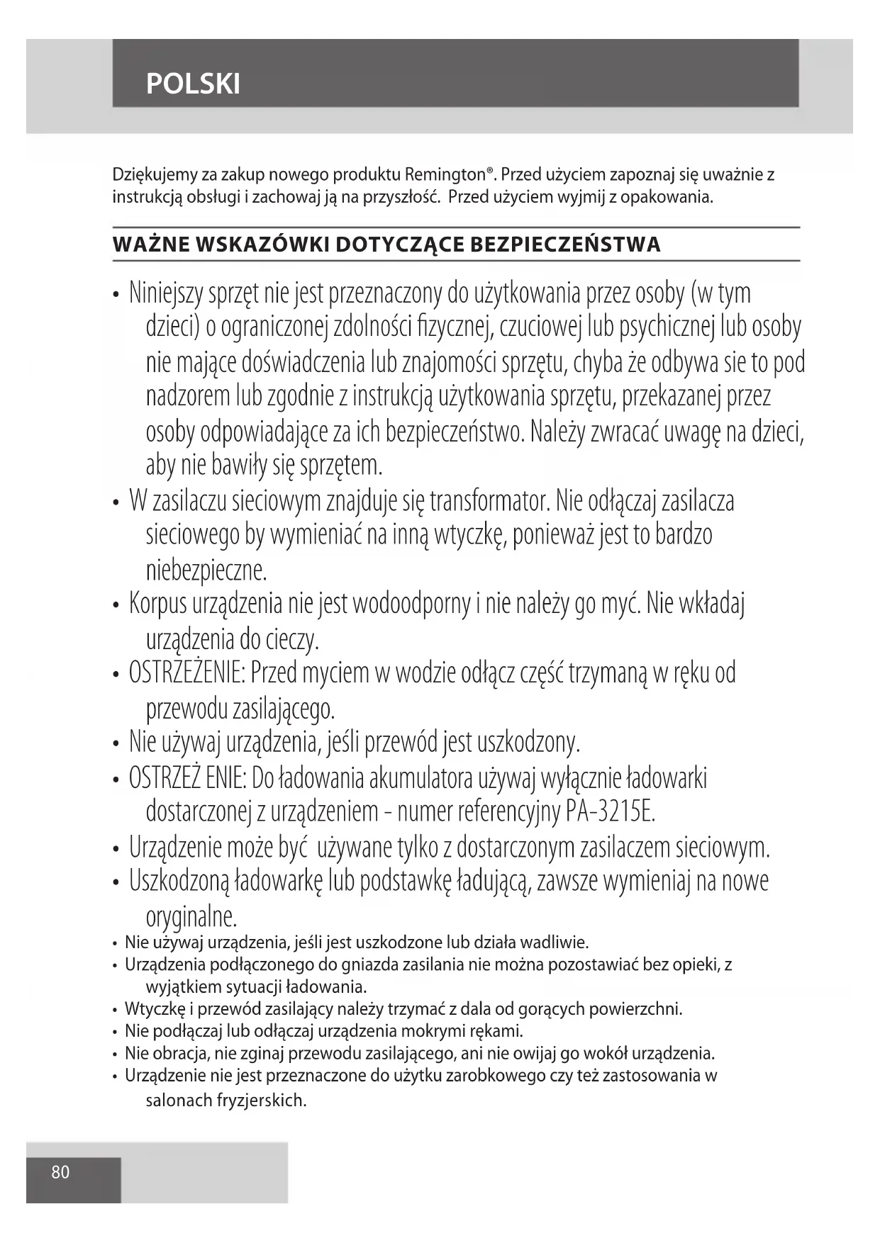AE80 Dziękujemy za zakup nowego produktu Remington®. Przed użyciem zapoznaj się uważnie z instrukcją obsługi i zachowaj ją na przyszłość. Przed użyciem wyjmij z opakowania. WAŻNE WSKAZÓWKI DOTYCZĄCE BEZPIECZEŃSTWA