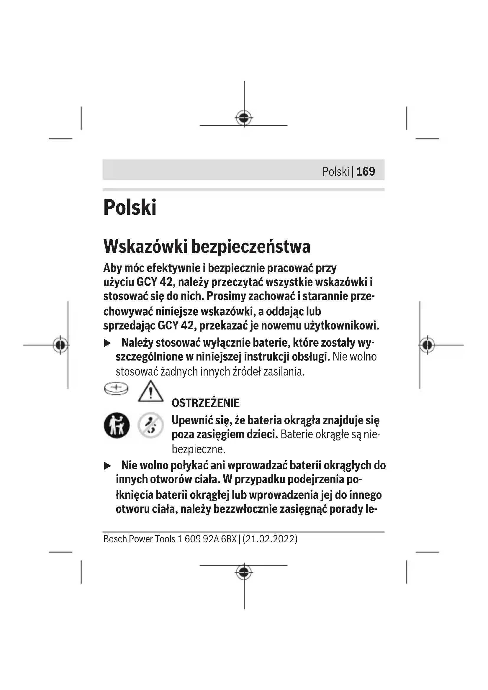 Karasoku Mahallesi 28028. Sokak No:20/A Merkez / ADANA Tel.: +903223599710 -3521379 Fax: +903223591323 E-mail: isiklar@isiklarelektrik.com Diğer servis adreslerini şurada bulabilirsiniz: www.bosch-pt.com/serviceaddresses Bosch Power Tools 1 609 92A 6RX | (21.02.2022)168 | Türkçe Tasfiye GCY 42 modülleri, aksesuar ve ambalaj malzemesi çevre dostu tasfiye amacıyla bir geri dönüşüm merkezine yollanmalıdır. Elektronik yapı parçalarını ve bataryaları evsel çöplerin içine atmayın! Sadece AB ülkeleri için: Atık elektrikli ve elektronik cihazlara ilişkin 2012/19/EU sayılı Avrupa yönetmeliği ve ulusal hukuktaki uygulaması uyarınca, kullanım ömrünü tamamlamış elektrikli el aletleri ve 2006/66/ EC sayılı Avrupa yönetmeliği uyarınca arızalı veya kullanım ömrünü tamamlamış aküler/piller ayrı ayrı toplanmalı ve çevre kurallarına uygun şekilde imha edilmek üzere bir geri dönüşüm merkezine gönderilmelidir. Atık elektrikli ve elektronik ekipmanlar uygun şekilde imha edilmezse olası tehlikeli maddelerin varlığı nedeniyle çevre ve insan sağlığı üzerinde zararlı etkileri olabilir. 1 609 92A 6RX | (21.02.2022) Bosch Power ToolsPolski | 169 Polski Wskazówki bezpieczeństwa Aby móc efektywnie i bezpiecznie pracować przy użyciuGCY42, należy przeczytać wszystkie wskazówki i stosować się do nich. Prosimy zachować i starannie prze- chowywać niniejsze wskazówki, a oddając lub sprzedającGCY42, przekazać je nowemu użytkownikowi. u Należy stosować wyłącznie baterie, które zostały wy- szczególnione w niniejszej instrukcji obsługi. Nie wolno stosować żadnych innych źródeł zasilania. OSTRZEŻENIE Upewnić się, że bateria okrągła znajduje się poza zasięgiem dzieci. Baterie okrągłe są nie- bezpieczne. u Nie wolno połykać ani wprowadzać baterii okrągłych do innych otworów ciała. W przypadku podejrzenia po- łknięcia baterii okrągłej lub wprowadzenia jej do innego otworu ciała, należy bezzwłocznie zasięgnąć porady le- Bosch Power Tools 1 609 92A 6RX | (21.02.2022)170 | Polski karza. Połknięcie baterii może w ciągu 2 godzin doprowa- dzić do poważnych obrażeń wewnętrznych i śmierci. u Wymianę baterii okrągłej należy przeprowadzić we wła- ściwy sposób. Istnieje zagrożenie wybuchem. u Należy stosować wyłącznie baterie okrągłe, które zosta- ły wyszczególnione w niniejszej instrukcji obsługi. Nie wolno stosować innych baterii okrągłych ani innych źródeł zasilania. u Nie wolno podejmować prób ponownego ładowania ba- terii ani doprowadzać do jej zwarcia. Bateria okrągła mo- że się rozszczelnić, eksplodować, zapalić i spowodować ob- rażenia u ludzi. u Rozładowane baterie okrągłe należy utylizować zgodnie z przepisami. Rozładowane baterie okrągłe mogą się rozsz- czelnić i uszkodzić produkt lub spowodować obrażenia u lu- dzi. u Nie wolno przegrzewać baterii okrągłej ani wrzucać jej do ognia. Bateria okrągła może się rozszczelnić, eksplodo- wać, zapalić i spowodować obrażenia u ludzi. u Nie wolno dopuścić do uszkodzenia baterii okrągłej ani jej demontować. Bateria okrągła może się rozszczelnić, eksplodować, zapalić i spowodować obrażenia u ludzi. 1 609 92A 6RX | (21.02.2022) Bosch Power ToolsPolski | 171 u Uszkodzona bateria okrągła nie może mieć kontaktu z wodą. Wydostający się z baterii lit może w reakcji z wodą utworzyć wodór i doprowadzić do pożaru, eksplozji lub ob- rażeń u ludzi. Znak słowny Bluetooth® oraz znaki graficzne (logo) są zare- jestrowanymi znakami towarowymi i stanowią własność Bluetooth SIG, Inc. Wszelkie wykorzystanie tych znaków przez firmę Robert Bosch Power Tools GmbH odbywa się zgodnie z umową licencyjną. u Nie należy używać modułu Bluetooth®, jeżeli osłony nie można zamknąć. W takim przypadku należy wyjąć baterię okrągłą i zlecić naprawę modułu. Opis urządzenia i jego zastosowania Użycie zgodne z przeznaczeniem Moduł Bluetooth® Low Energy Module GCY42 umożliwia per- sonalizację i kontrolę elektronarzędzia, a także transmisję ustawień i danych, w oparciu o technologię bezprzewodową Bluetooth®. Na transfer danych konieczne jest zezwolenie ze strony użytkownika. Bosch Power Tools 1 609 92A 6RX | (21.02.2022)172 | Polski Informacje dotyczące funkcji Connectivity można znaleźć w aplikacji Bosch Toolbox lub instrukcji obsługi zastosowanego elektronarzędzia. Przedstawione graficznie komponenty Numeracja przedstawionych komponentów odnosi się do ry- sunków, znajdujących się na stronach graficznych. (1) Bateria okrągła (2) Moduł Bluetooth® Low Energy Module GCY 42 (3) Zaślepka