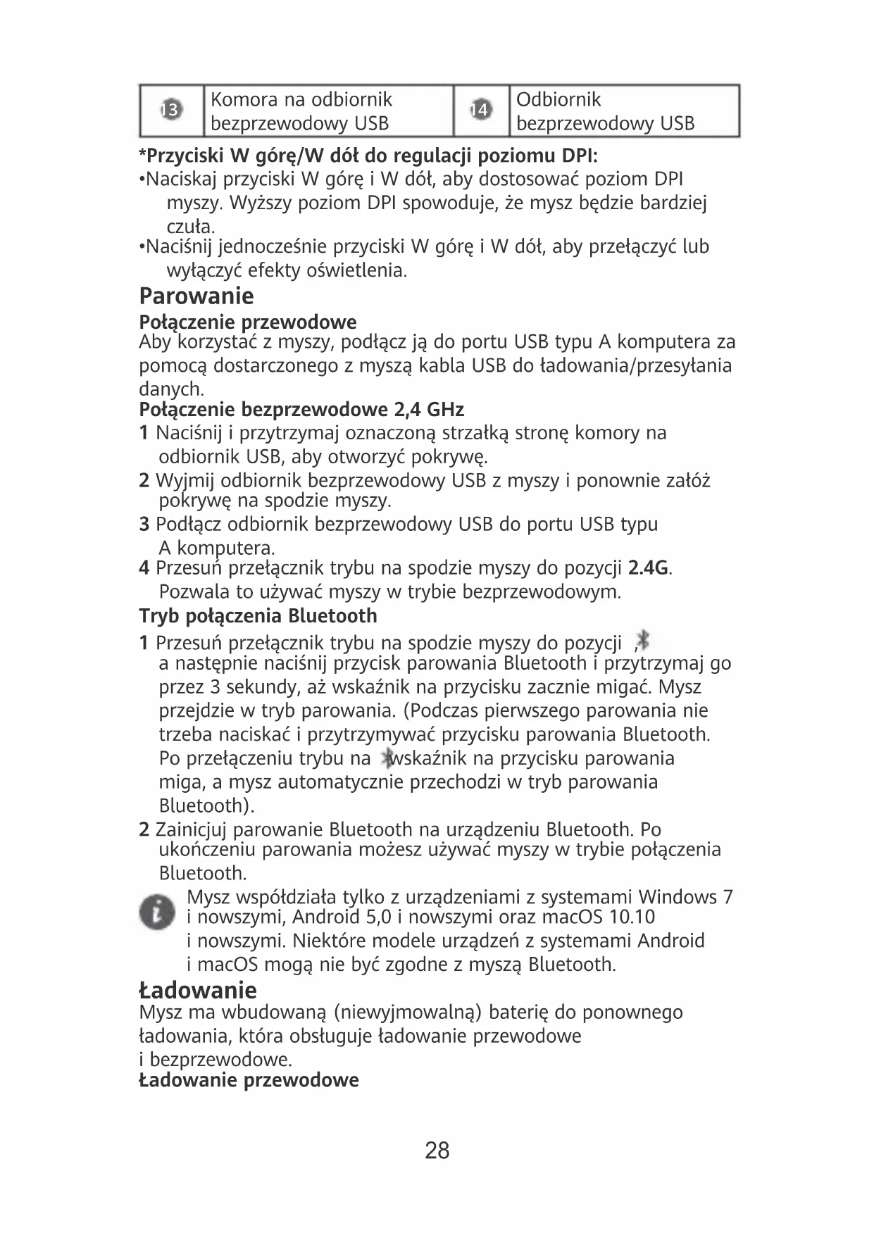 - Naciśnij jednocześnie przyciski W górę i W dół, aby przełączyć lub wyłączyć efekty oświetlenia. Parowanie Połączenie przewodowe Aby korzystać z myszy, podłącz ją do portu USB typu A komputera za pomocą dostarczonego z myszą kabla USB do ładowania/przesyłania danych. Połączenie bezprzewodowe 2,4 GHz 1 Naciśnij i przytrzymaj oznaczoną strzałką stronę komory na odbiornik USB, aby otworzyć pokrywę. 2 Wyjmij odbiornik bezprzewodowy USB z myszy i ponownie załóż pokrywę na spodzie myszy. 3 Podłącz odbiornik bezprzewodowy USB do portu USB typu A komputera. 4 Przesuń przełącznik trybu na spodzie myszy do pozycji 2.4G. Pozwala to używać myszy w trybie bezprzewodowym. Tryb połączenia Bluetooth 1 Przesuń przełącznik trybu na spodzie myszy do pozycji , a następnie naciśnij przycisk parowania Bluetooth i przytrzymaj go przez 3 sekundy, aż wskaźnik na przycisku zacznie migać. Mysz przejdzie w tryb parowania. (Podczas pierwszego parowania nie trzeba naciskać i przytrzymywać przycisku parowania Bluetooth. Po przełączeniu trybu na wskaźnik na przycisku parowania miga, a mysz automatycznie przechodzi w tryb parowania Bluetooth). 2 Zainicjuj parowanie Bluetooth na urządzeniu Bluetooth. Po ukończeniu parowania możesz używać myszy w trybie połączenia Bluetooth. Mysz współdziała tylko z urządzeniami z systemami Windows 7 i nowszymi, Android 5,0 i nowszymi oraz macOS 10.10 i nowszymi. Niektóre modele urządzeń z systemami Android i macOS mogą nie być zgodne z myszą Bluetooth. Ładowanie Mysz ma wbudowaną (niewyjmowalną) baterię do ponownego ładowania, która obsługuje ładowanie przewodowe i bezprzewodowe. Ładowanie przewodowe 28Aby naładować mysz, podłącz ją do portu USB typu A komputera lub do zasilacza za pomocą dostarczonego z myszą kabla USB do ładowania/przesyłania danych. Ładowanie bezprzewodowe Mysz jest zgodna ze standardem ładowania bezprzewodowego Qi. Mysz można ładować, umieszczając ją na panelu ładowania bezprzewodowego i wyrównując obszar ładowania bezprzewodowego na spodzie myszy względem obszaru ładowania bezprzewodowego na panelu. Panel ładowania bezprzewodowego należy nabyć osobno. Więcej funkcji Przejdź do strony https://consumer.huawei.com/pl/support/ , wyszukaj nazwę swojego urządzenia, a następnie pobierz i zainstaluj sterownik myszy, aby odkryć więcej jej funkcji. Bezpieczeństwo użycia